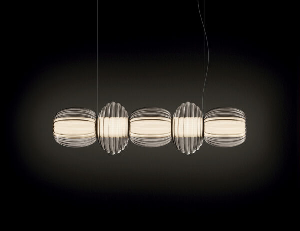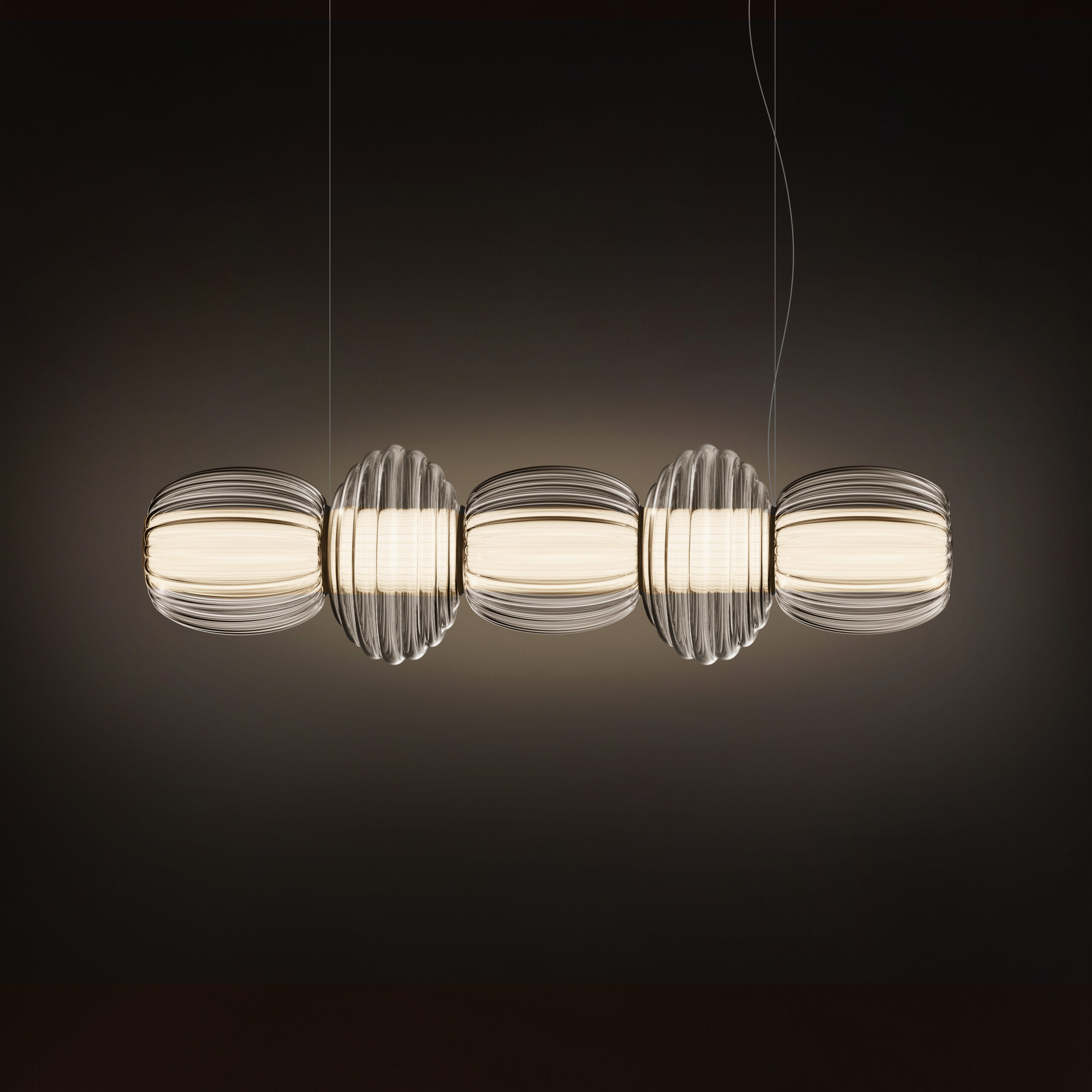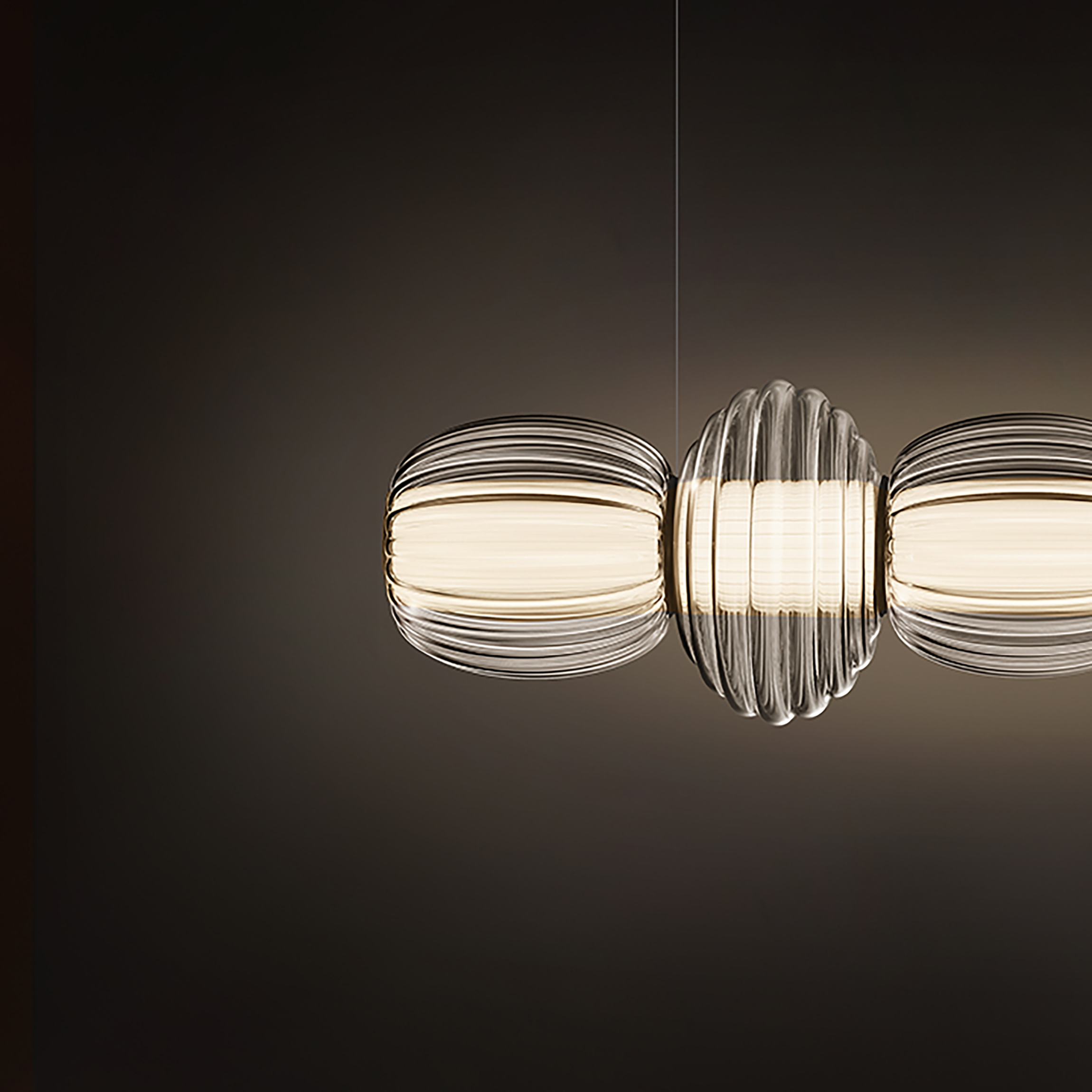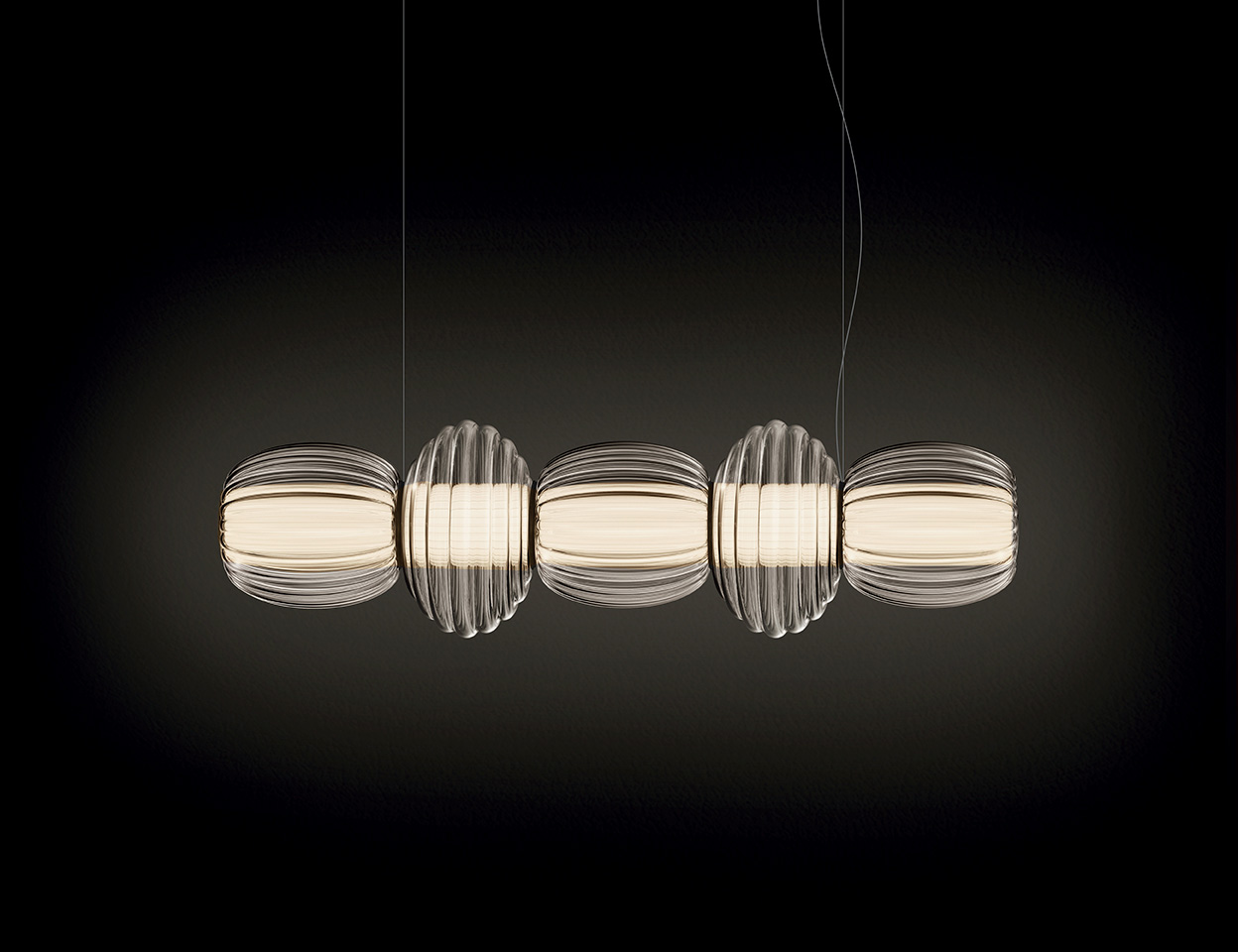 Vetro soffiato e diffusore in tessuto plissé si fondono in sospensioni, lampade da tavolo e da terra.