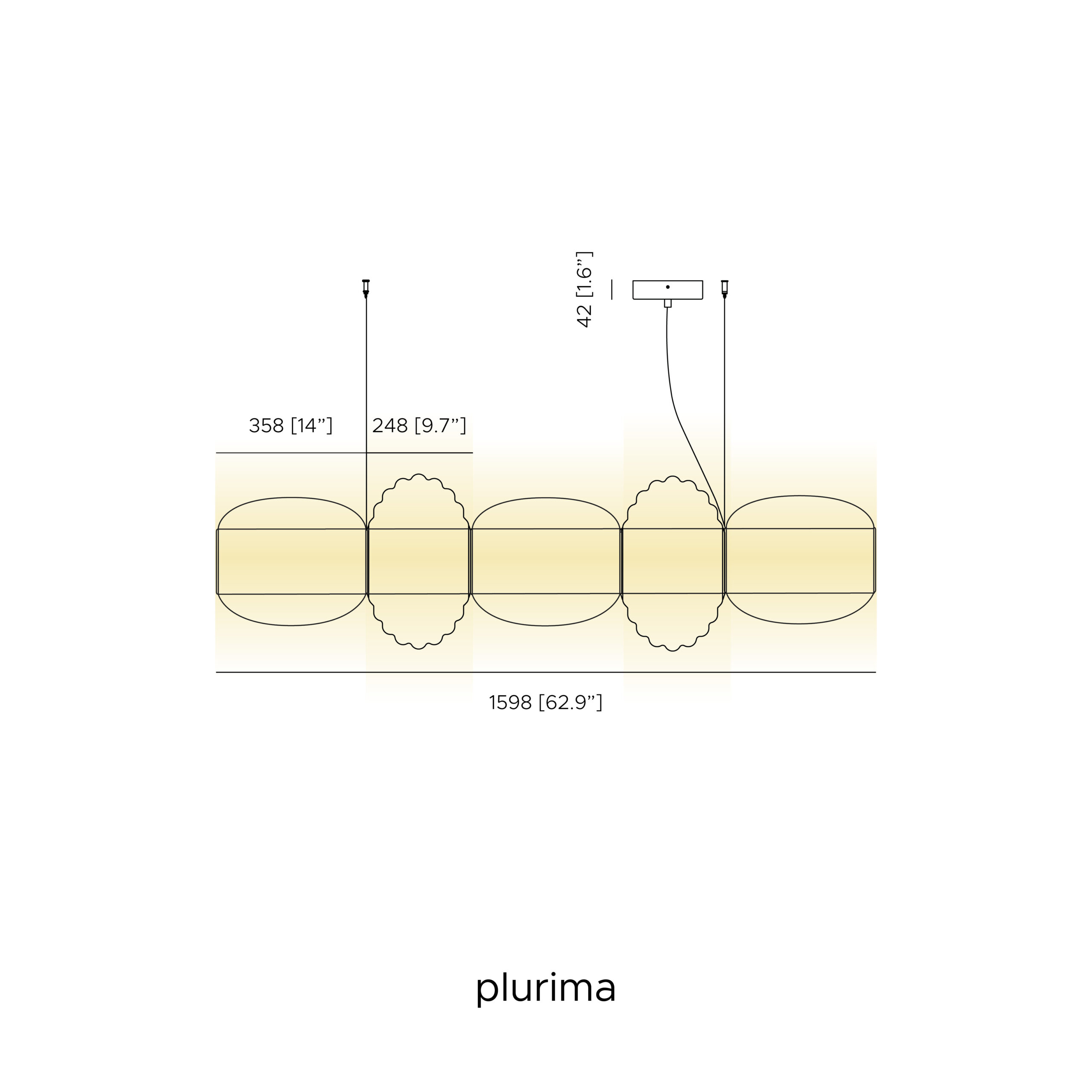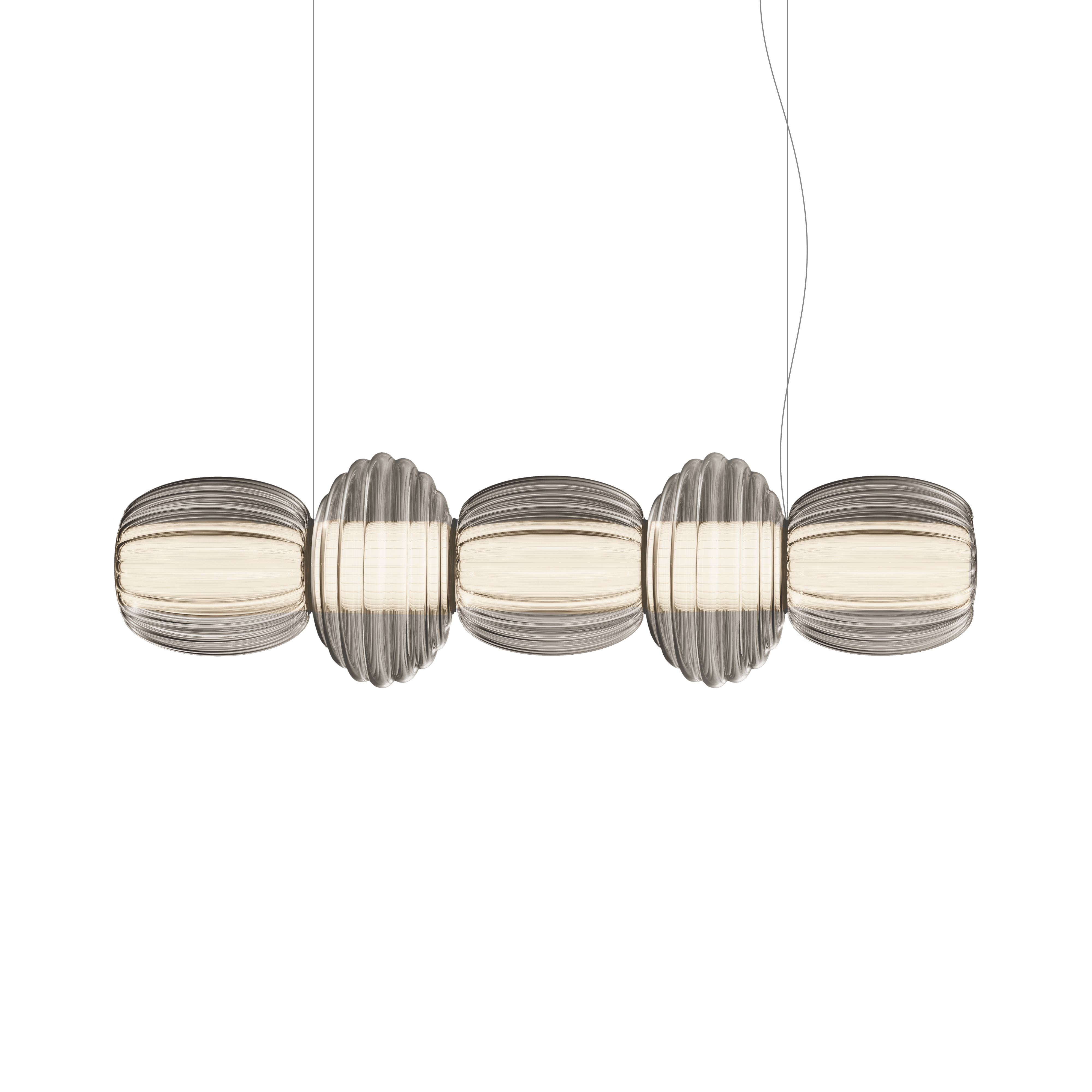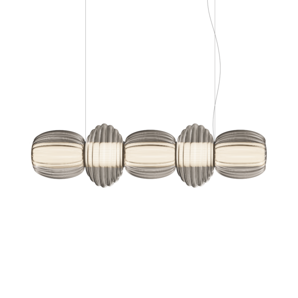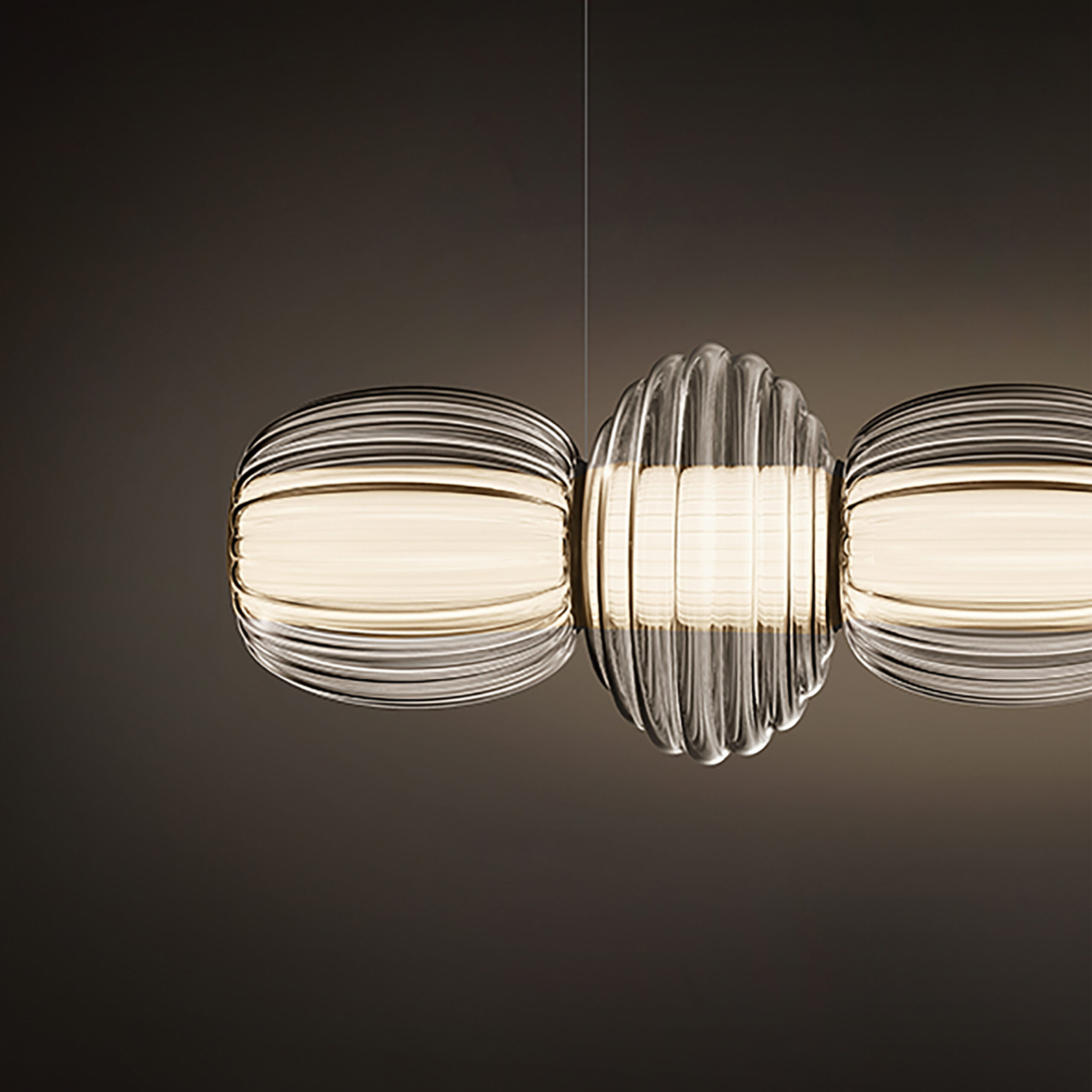 Vetro soffiato e diffusore in tessuto plissé si fondono in sospensioni, lampade da tavolo e da terra.