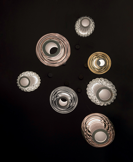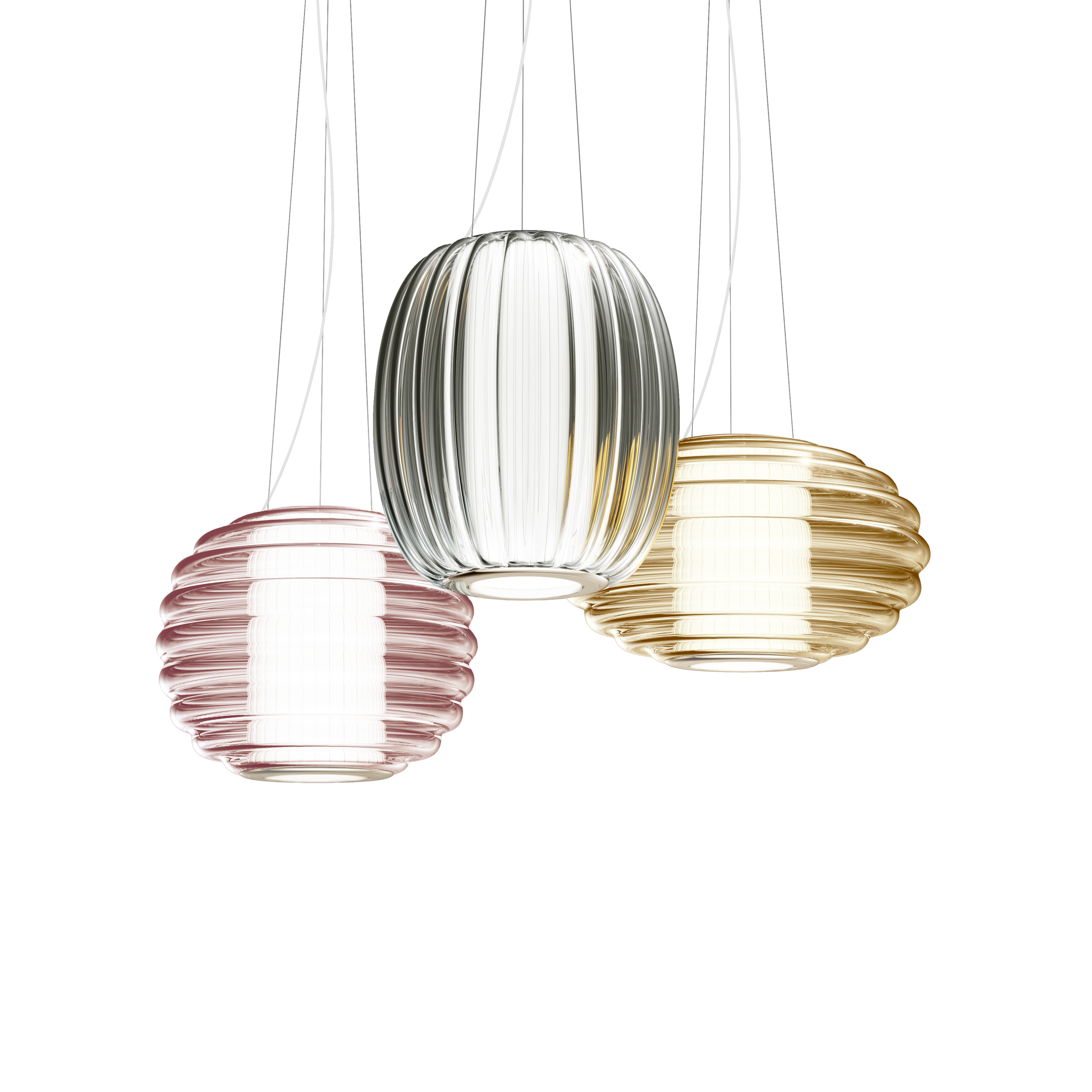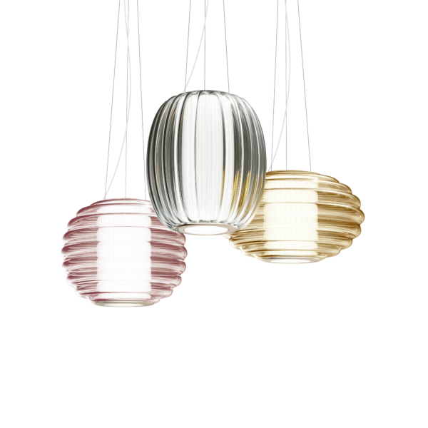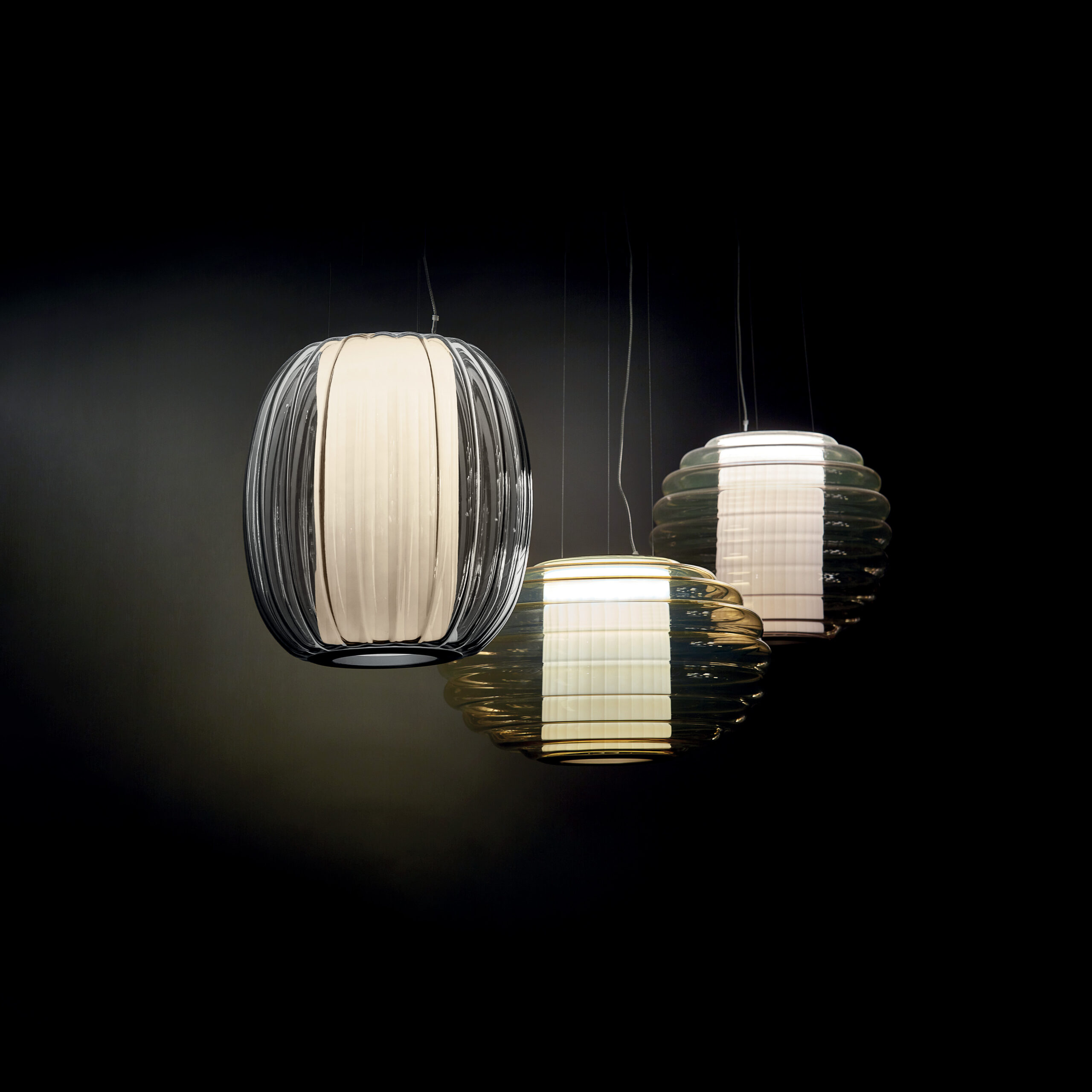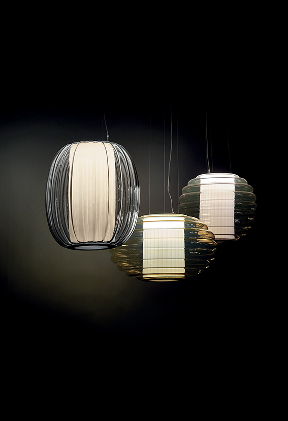 Vetro soffiato e diffusore in tessuto plissé si fondono in sospensioni, lampade da tavolo e da terra.