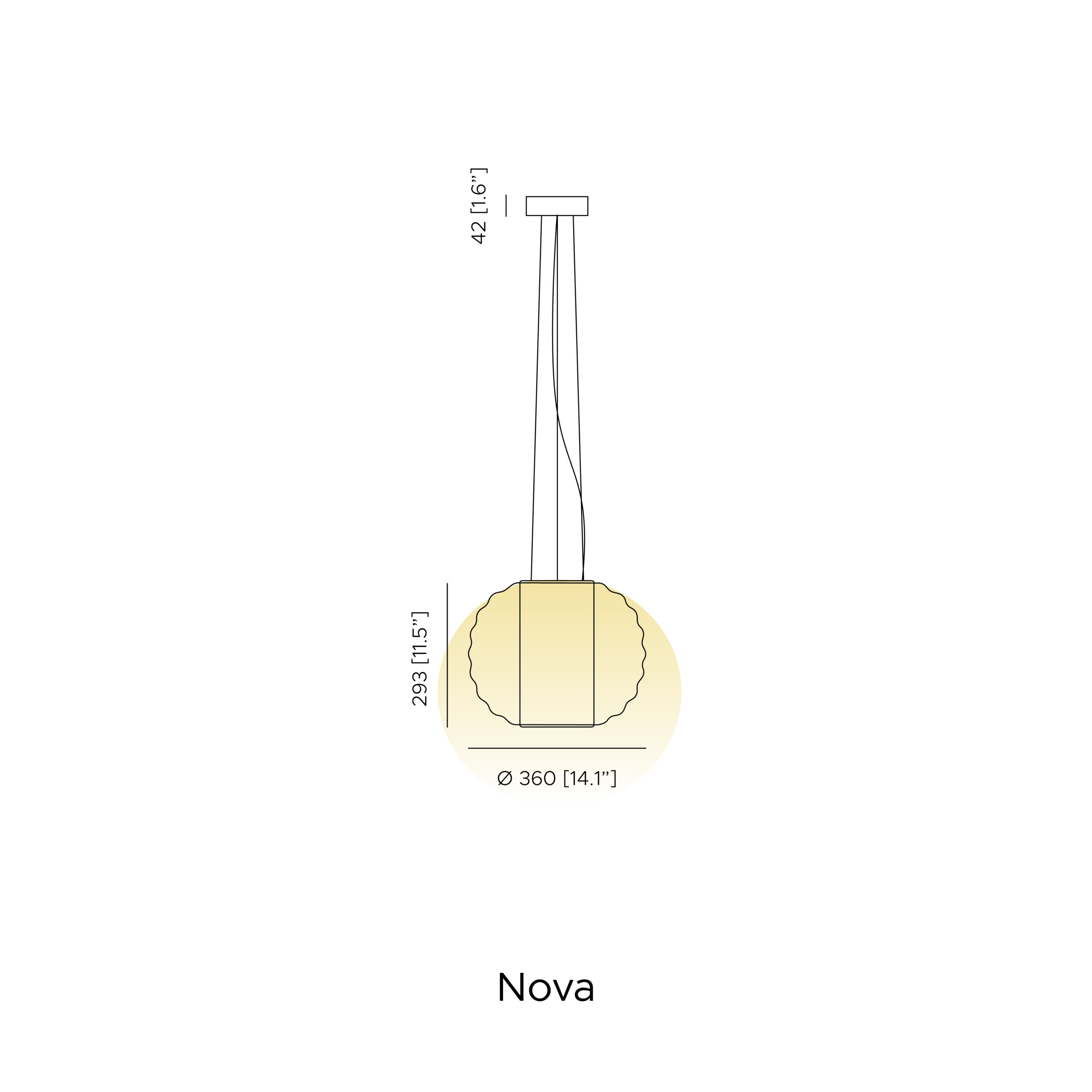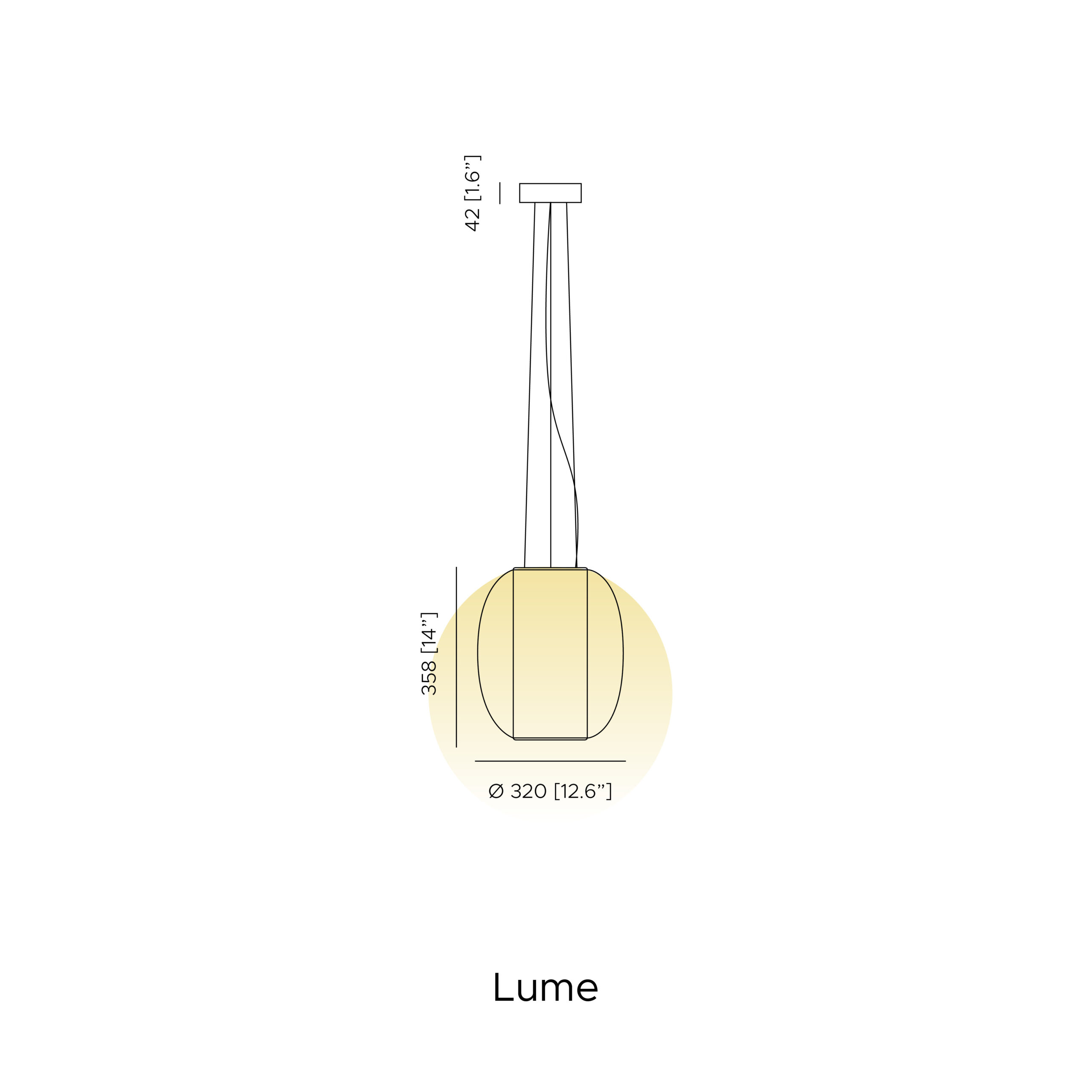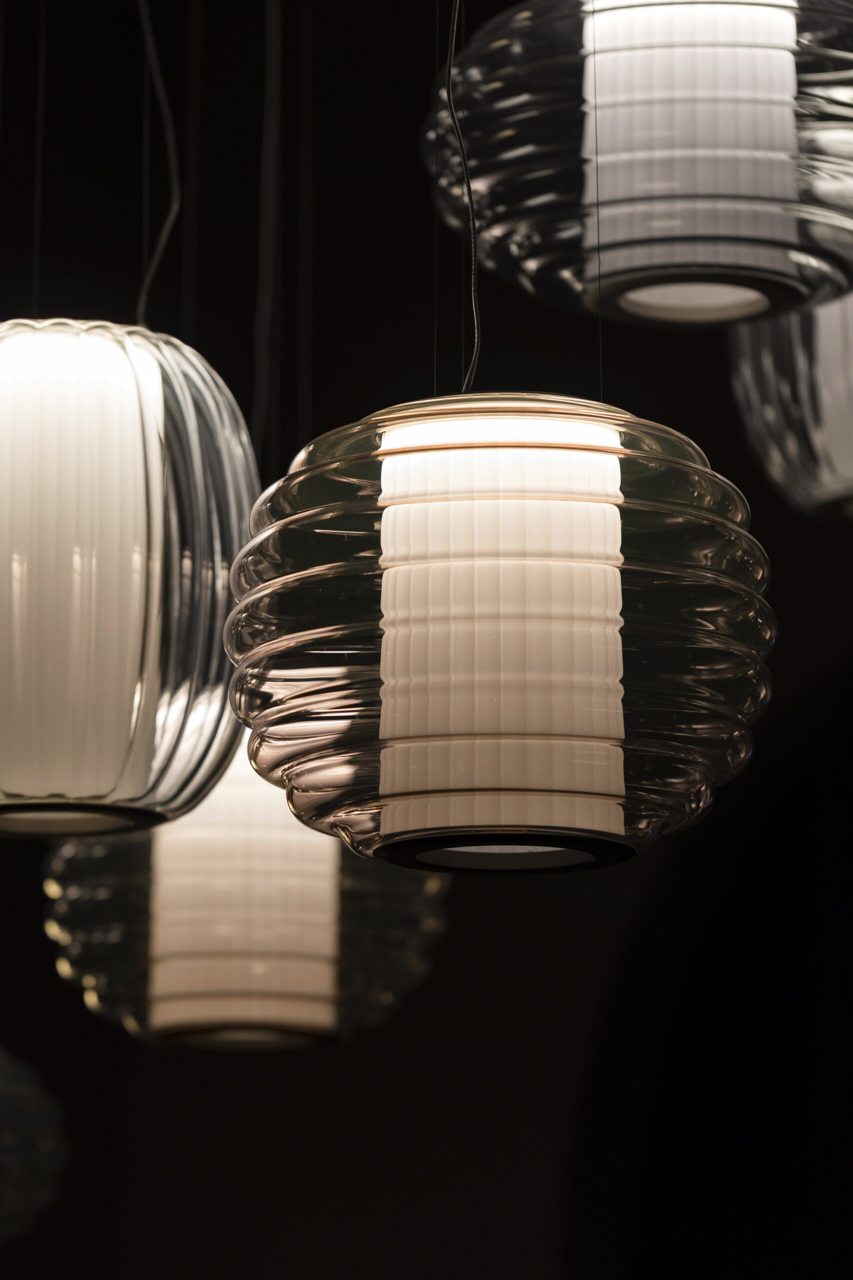 Vetro soffiato e diffusore in tessuto plissé si fondono in sospensioni, lampade da tavolo e da terra.