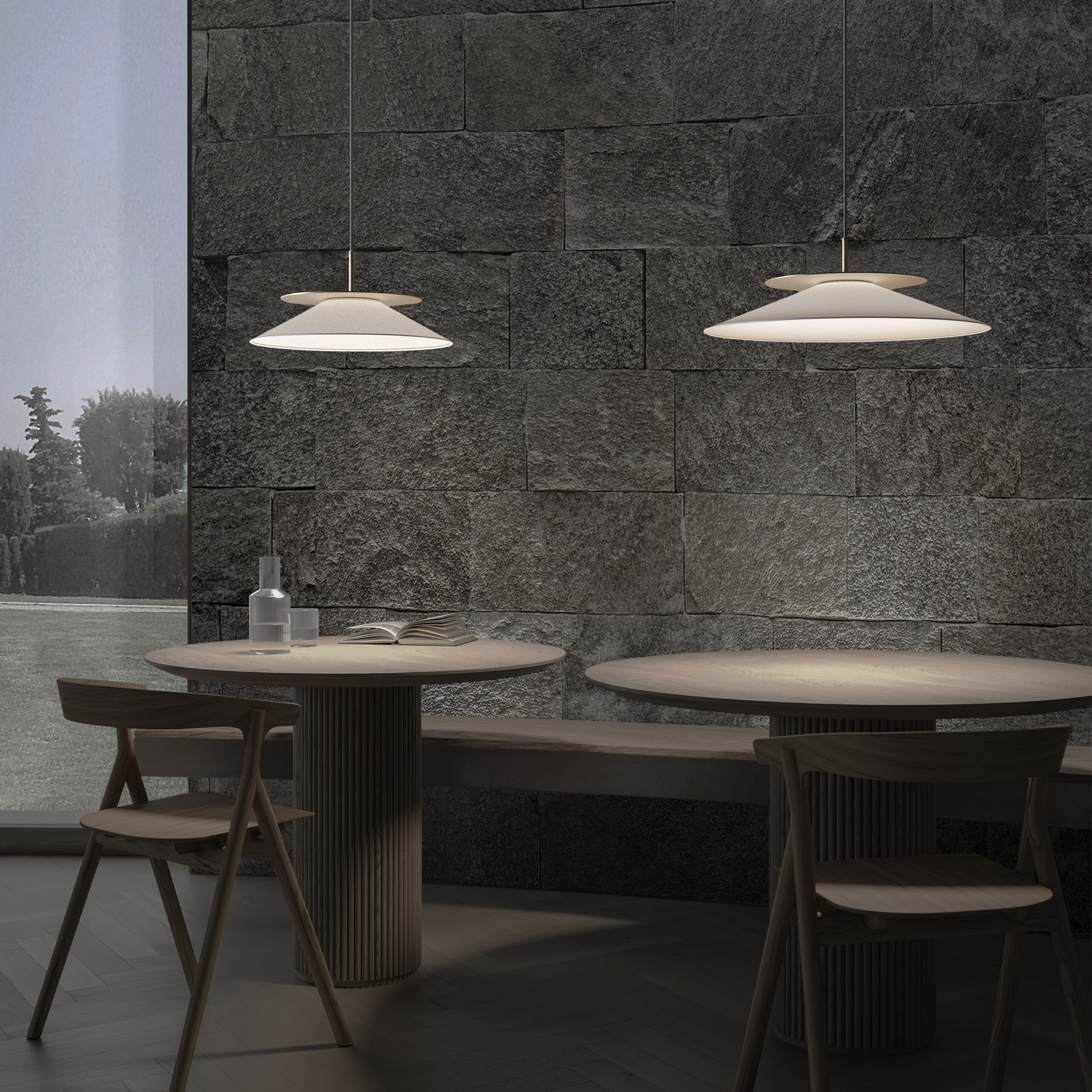 Una gamma di prodotti caratterizzata da una forma pulita e lineare, ma con una forte personalità. Il paralume di Asia si ispira ai cappelli a punta dei raccoglitori di riso cinesi, mentre la combinazione di materiali come tessuto, vetro e Metallolo rappresenta un ulteriore elemento distintivo della collezione.