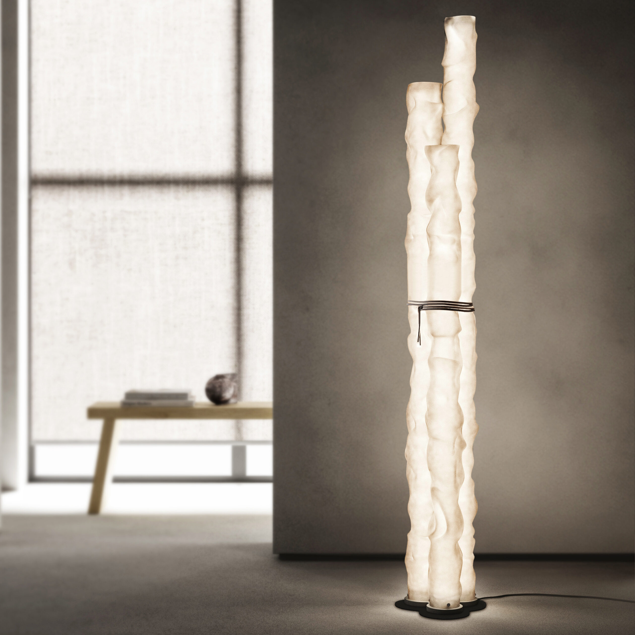 La lampada da terra Baggy Trio è composta da tre elementi diffusori in policarbonato bisatinato di diverse altezze – 150, 160 e 180 cm – dall'aspetto irregolare di un tubo di carta stropicciato, mentre la base è in finitura grigia. La caratteristica corda tessile morbida bianco/grigio – dettaglio che esprime la cifra stilistica archi-decorativa del brand – diventa elemento di raccordo per le varianti da tavolo e da terra, sorregge la lampada nella versione a sospensione.