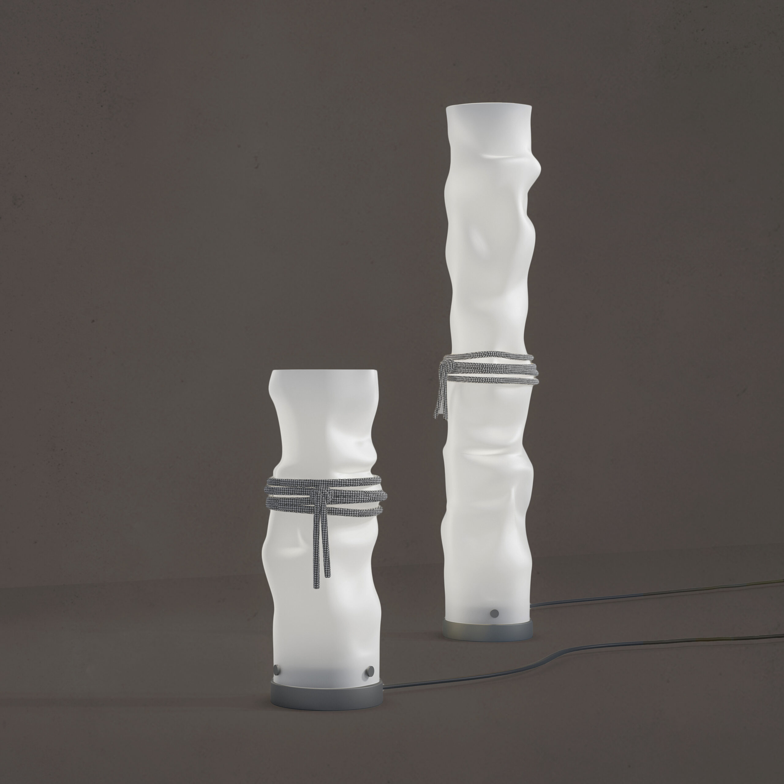 La lampada da tavolo Baggy (piccola e media) ha un diffusore in policarbonato bisatinato dall'aspetto irregolare, come fosse un tubo di carta stropicciato, mentre la base è in finitura grigia. La caratteristica corda tessile morbida bianco/grigio – dettaglio che esprime la cifra stilistica archi-decorativa del brand – diventa elemento di raccordo per le varianti da tavolo e da terra e sorregge la lampada nella versione a sospensione. Il prodotto nella versione da tavolo è disponibile in due altezze: 30 e 60 cm.