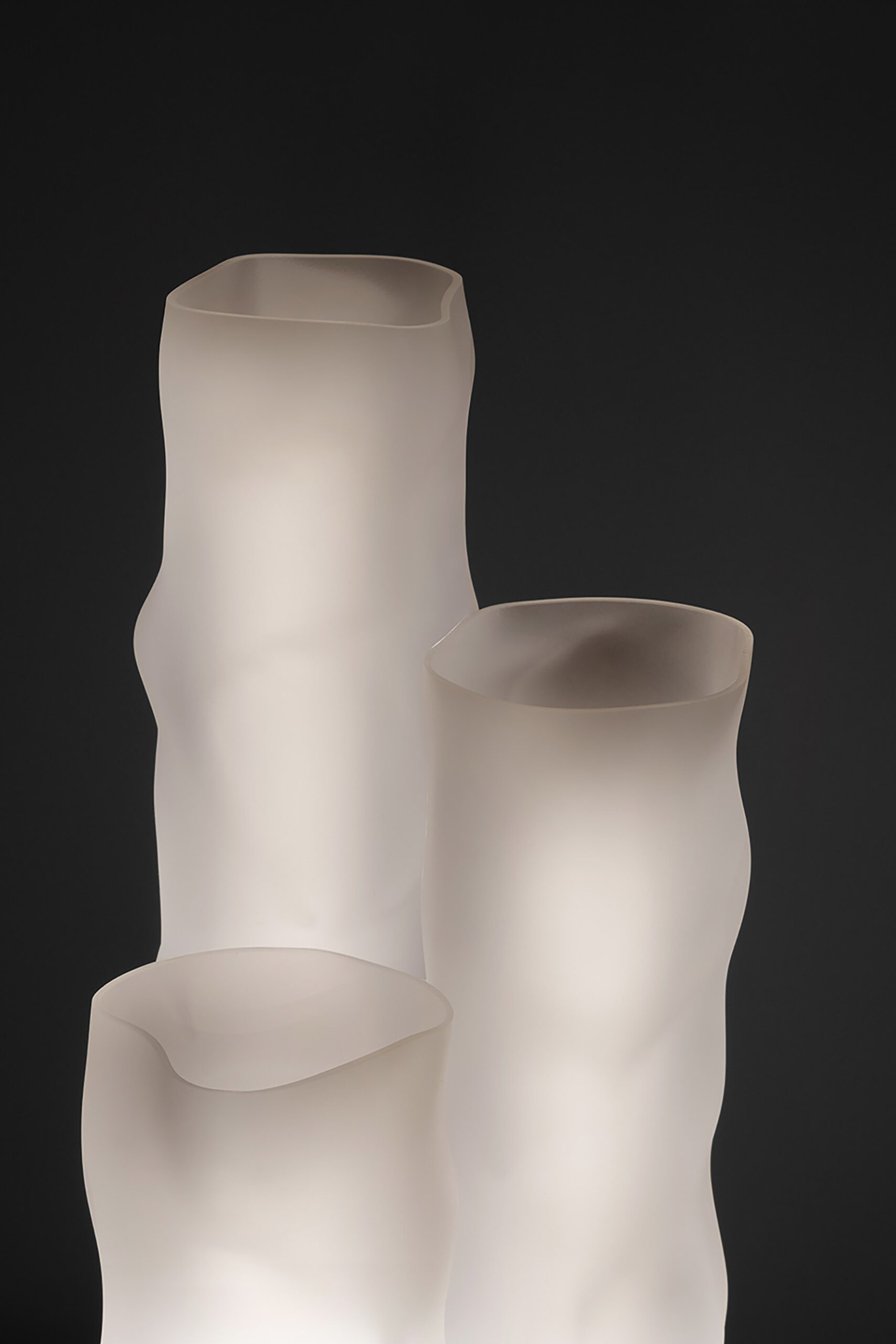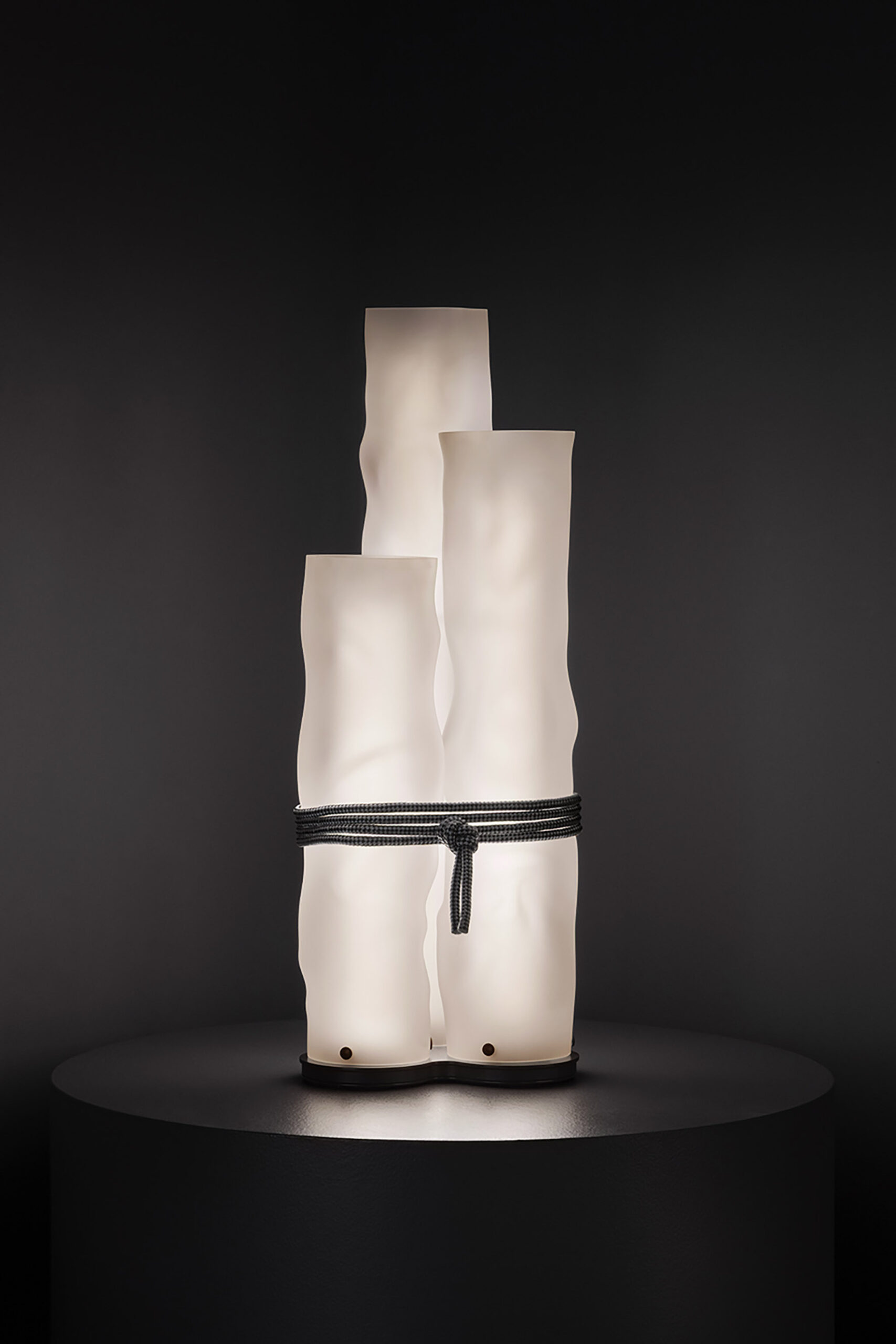 La lampada da tavolo Baggy Trio è composta da tre elementi diffusori in policarbonato bisatinato di diverse altezze – 30, 50 e 60 cm – che hanno l'aspetto irregolare di tubi di carta stropicciata, mentre la base è in finitura grigia. La caratteristica corda tessile morbida bianco/grigio – dettaglio che esprime la cifra stilistica archi-decorativa del brand – diventa elemento di raccordo per le varianti da tavolo e da terra e sorregge la lampada nella versione a sospensione.