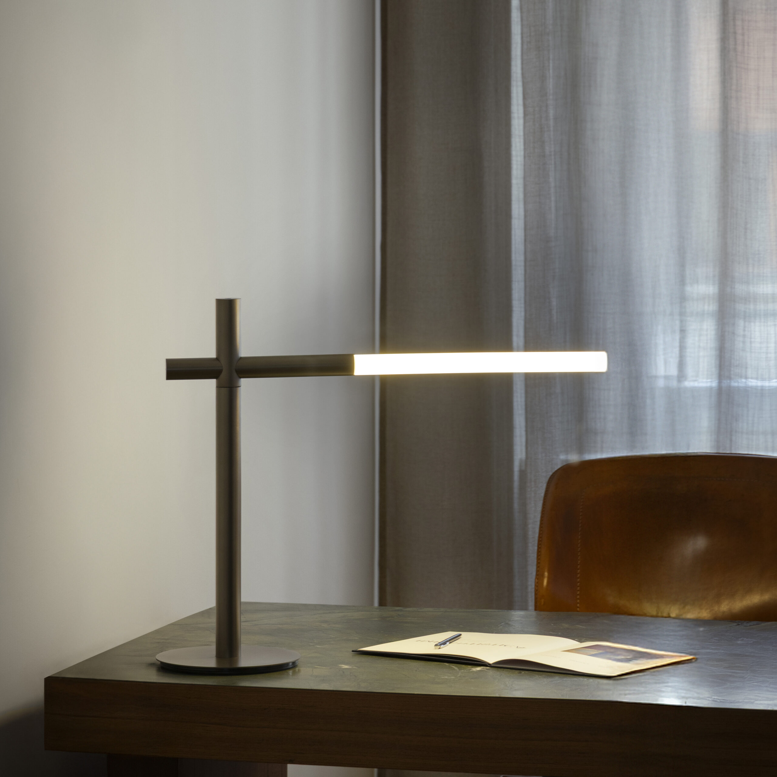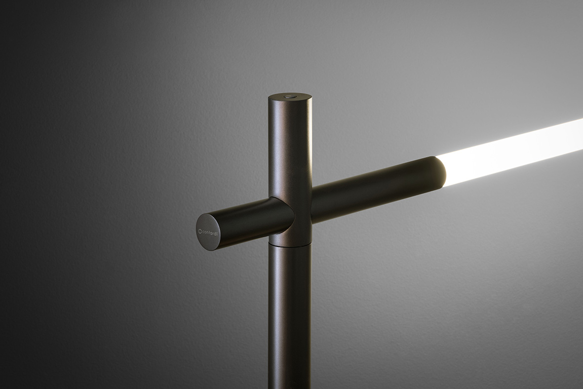 La sorgente luminosa tubolare, realizzata in vetro bianco latte, è stata fatta realizzare appositamente da Contardi, con attacco E14 a bassissima tensione (24V).