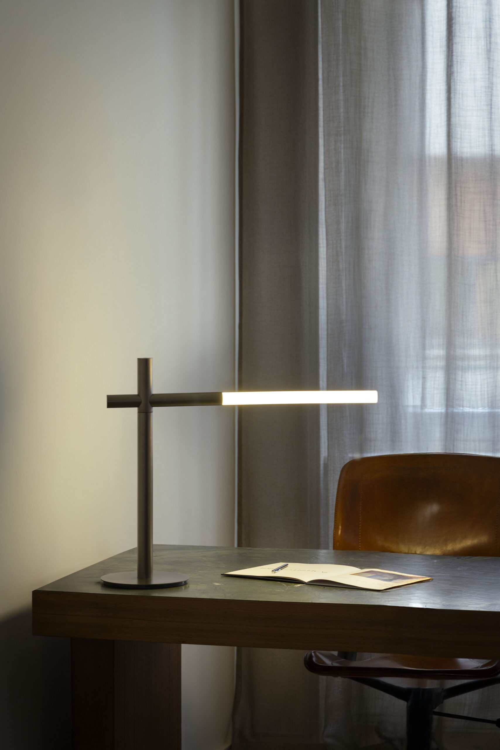 Le sorgenti luminose tubolari, realizzate in vetro bianco latte in tre diverse dimensioni, sono state fatte realizzare appositamente da Contardi, con attacco E14 a bassissima tensione (24V).
