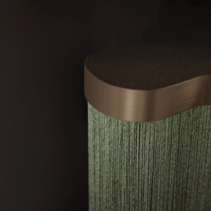 Calypso è una collezione di lampade a sospensione ispirata al periodo art déco, con tessuti le cui trame e motivi geometrici in bianco e nero mescolati a colori accesi ispirati alla cultura sudamericana e tropicale, si rivela un risultato molto originale. La versione indoor è caratterizzata da un cordone di seta intrecciato verde. Il supporto è un anello in ottone satinato. Il diffusore è in vetro trasparente.