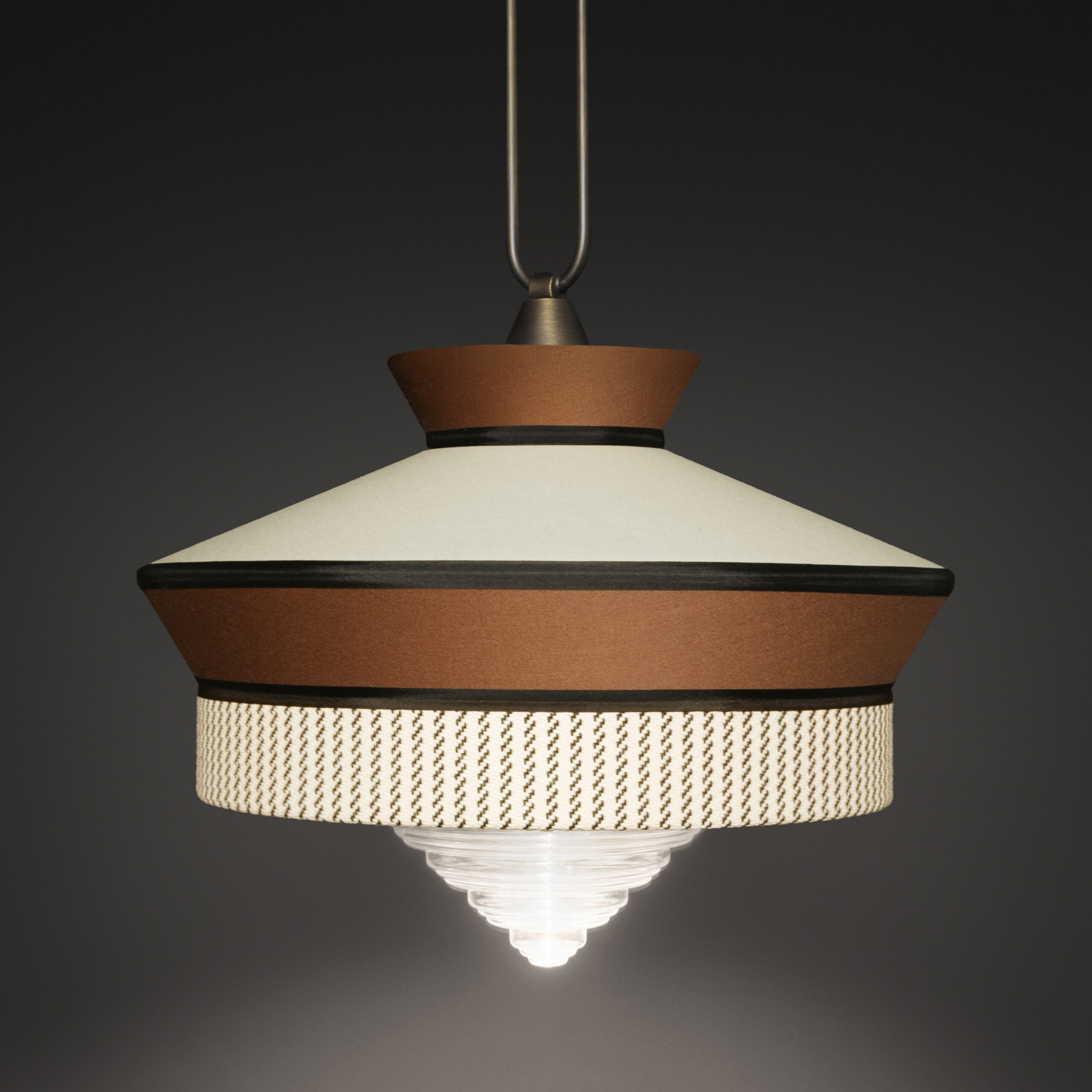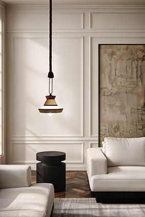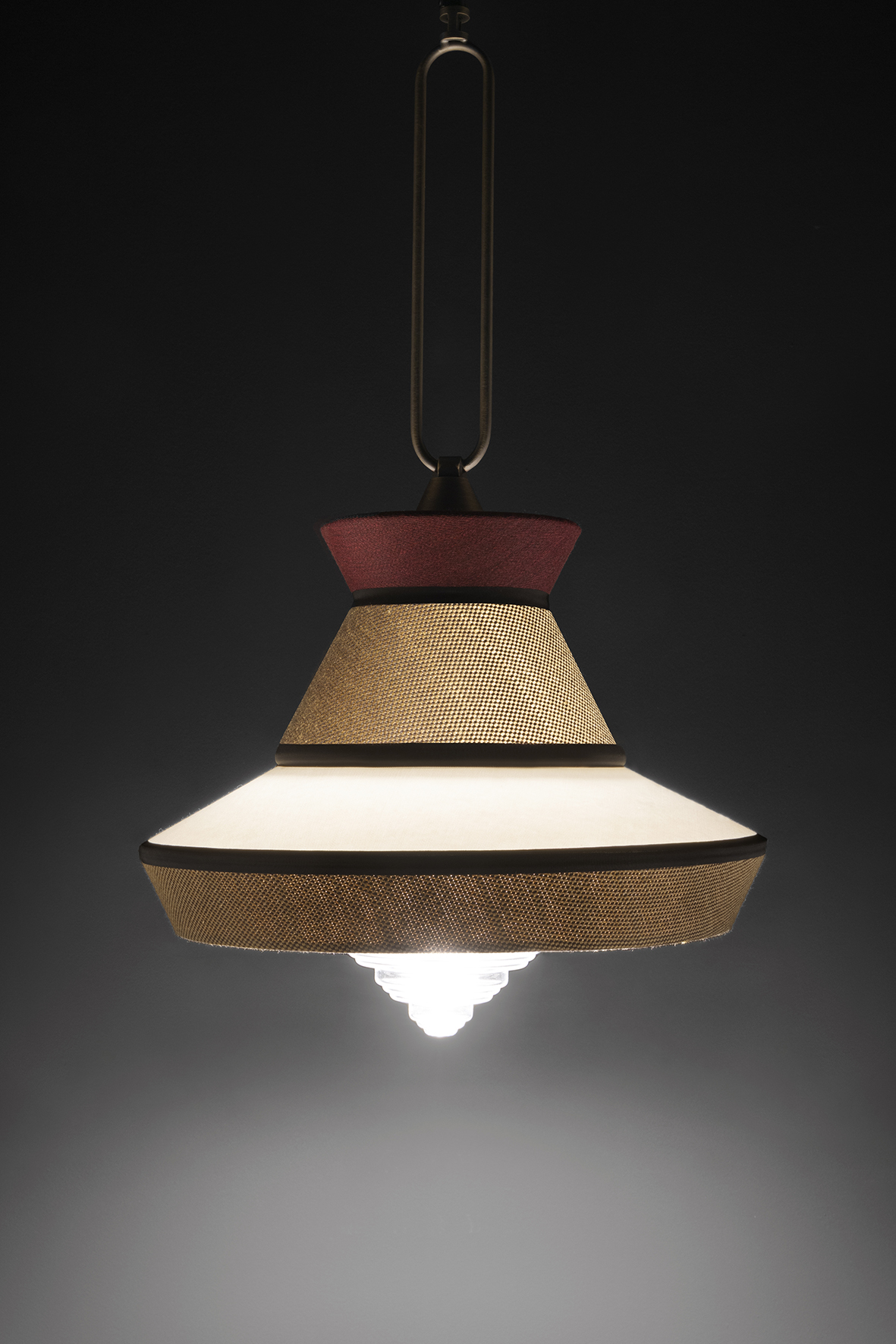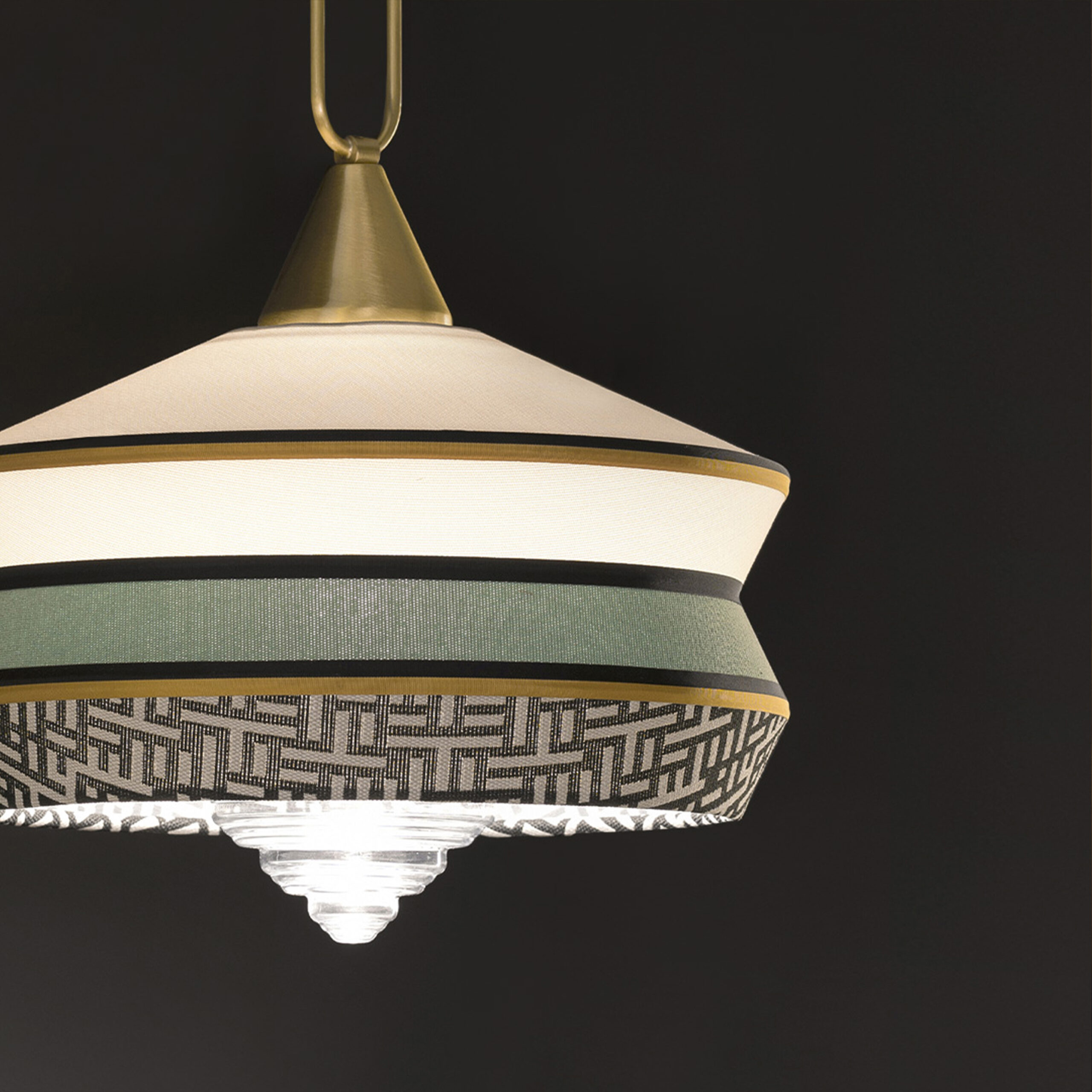 Calypso è una collezione di lampade a sospensione ispirata al periodo art déco, con tessuti le cui trame e motivi geometrici in bianco e nero mescolati a colori accesi ispirati alla cultura sudamericana e tropicale, si rivela un risultato molto originale. La versione indoor è caratterizzata da un cordone di seta intrecciato verde. Il supporto è un anello in ottone satinato. Il diffusore è in vetro trasparente.