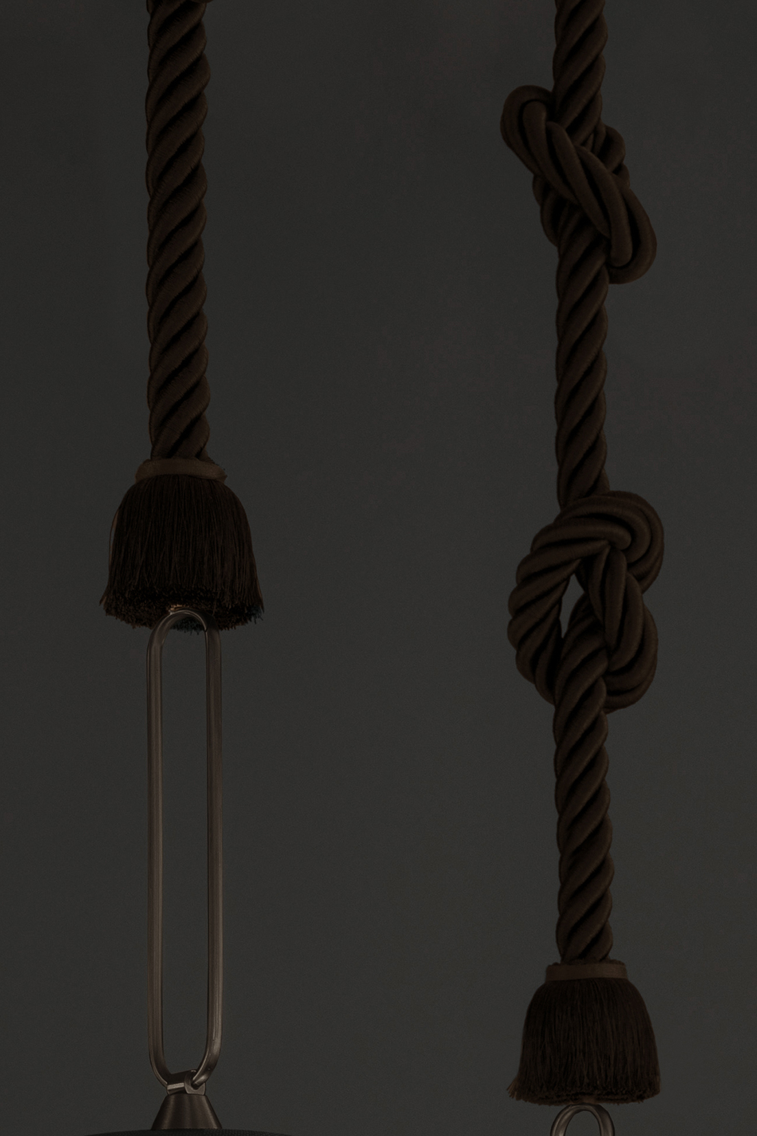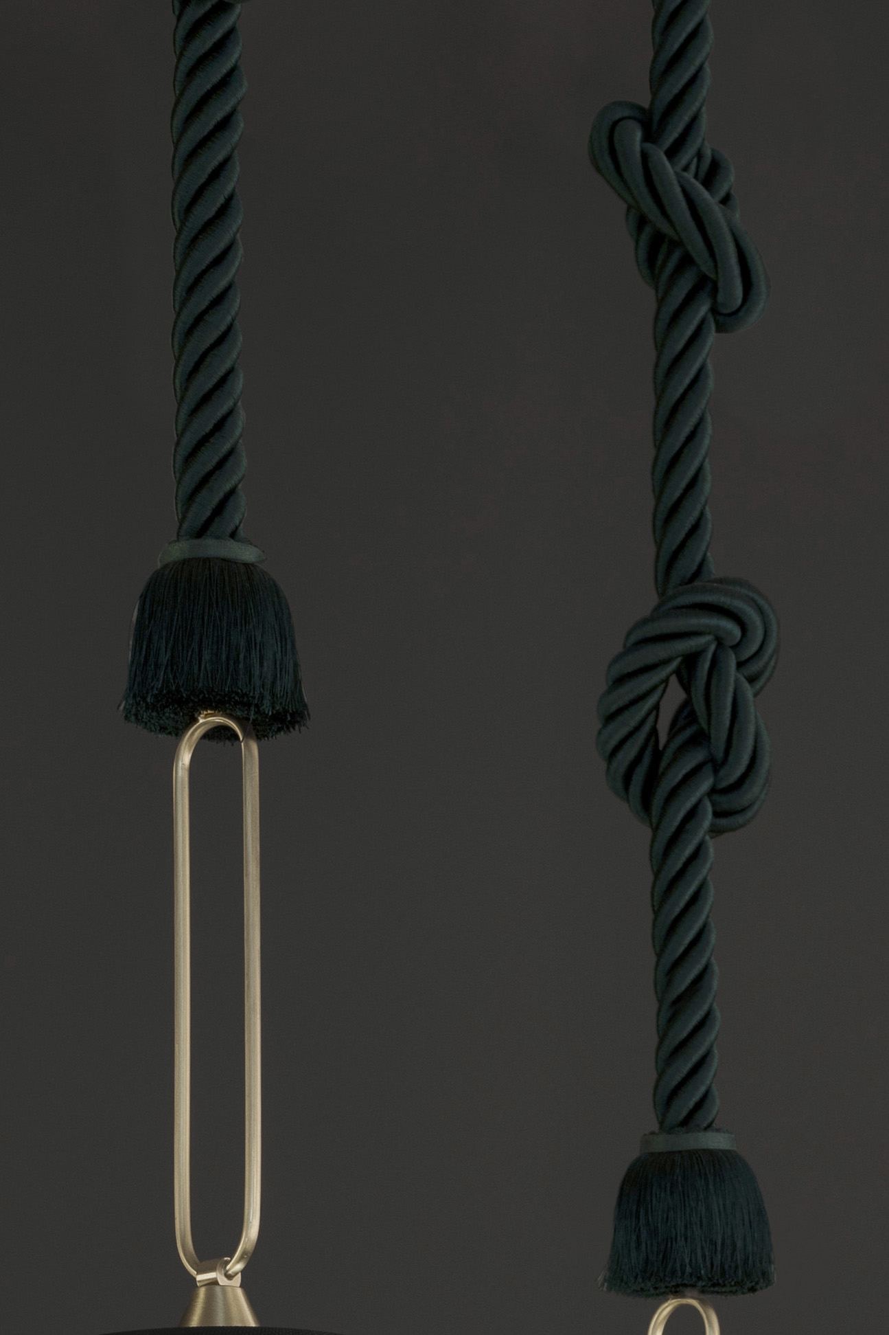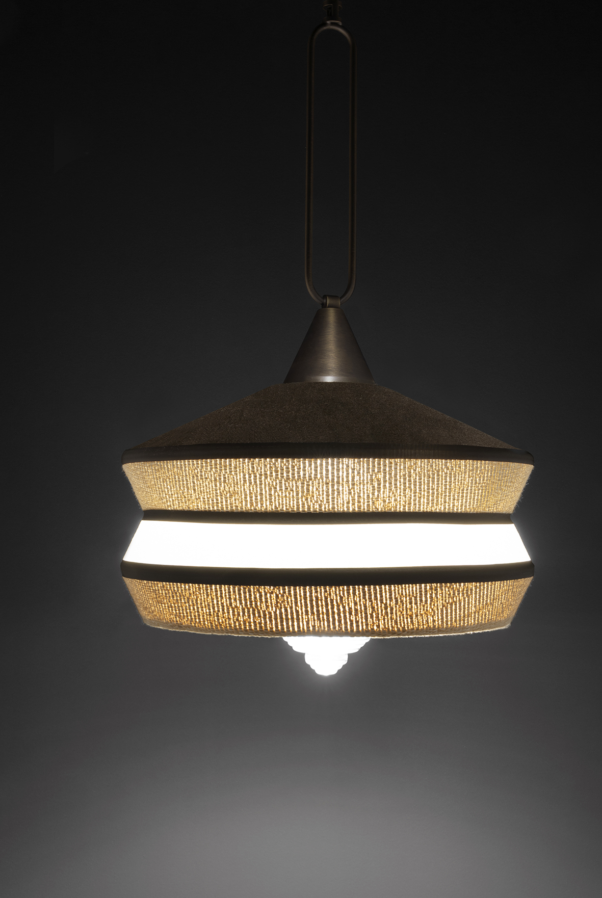 Calypso è una collezione di lampade a sospensione ispirata al periodo art déco, con tessuti le cui trame e motivi geometrici in bianco e nero mescolati a colori accesi ispirati alla cultura sudamericana e tropicale, si rivela un risultato molto originale. La versione indoor è caratterizzata da un cordone di seta intrecciato verde. Il supporto è un anello in ottone satinato. Il diffusore è in vetro trasparente.
