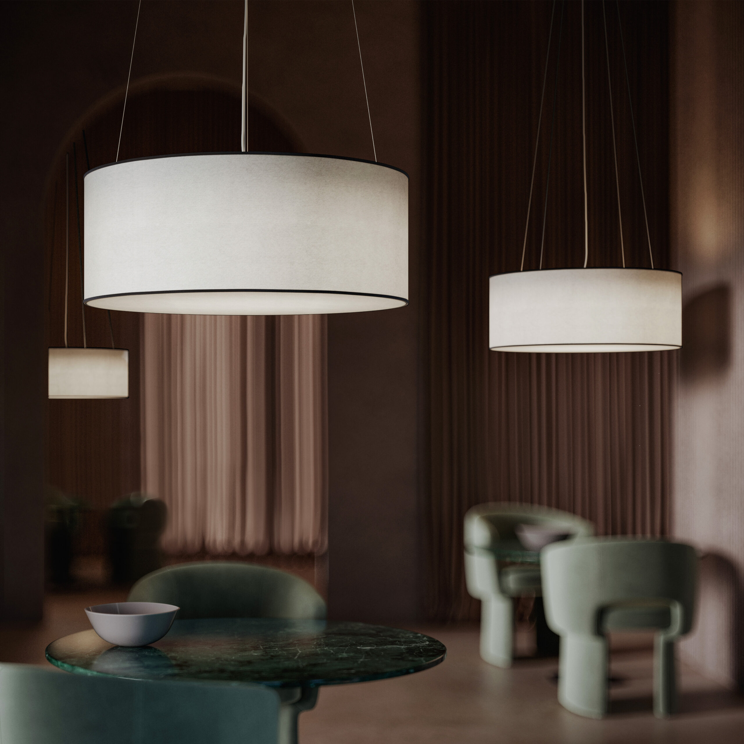 Un prodotto semplice ma completo che permette di personalizzare il paralume in tessuto con passamanerie di diversi colori. Tutte le dimensioni sono disponibili con due differenti sorgenti luminose: la versione con lampadine E27 montate vicino al paralume che assicurano una performance luminosa ottimale e la versione con piastra LED personalizzata, molto compatta, pensata per l'utilizzo in spazi commerciali, come uffici e negozi al dettaglio. Quest'ultima offre la possibilità - a differenza della versione tradizionale - di ridurre notevolmente l'altezza del paralume.