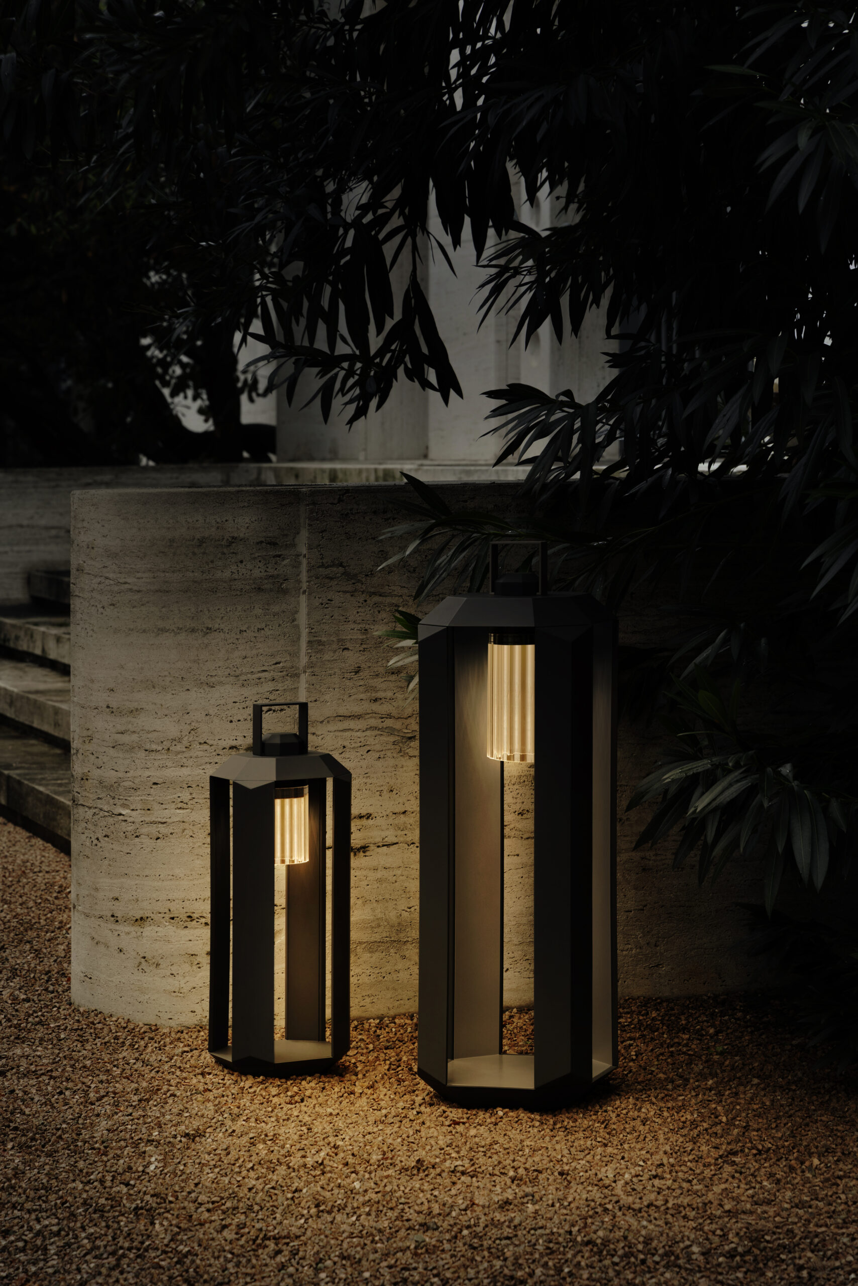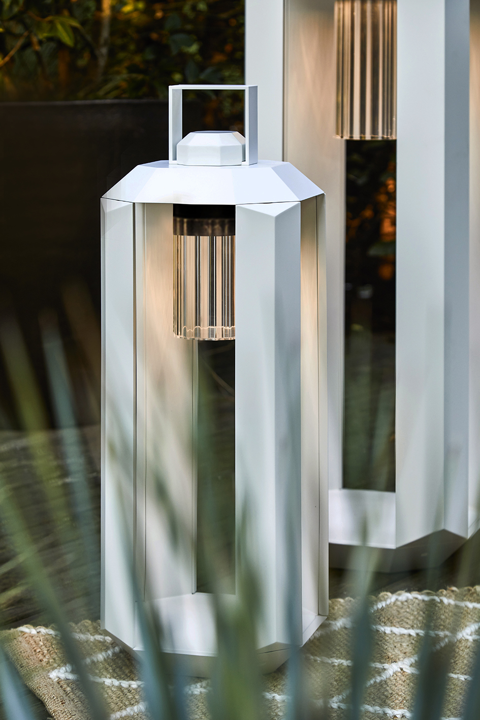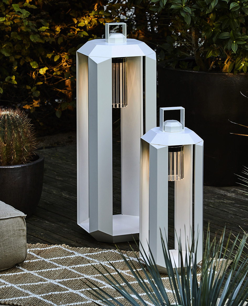 La collezione Cube, firmata da Massimiliano Raggi, reinterpreta con eleganza la lanterna portatile ed è proposta nelle finiture bronzo o bianco.