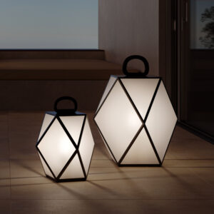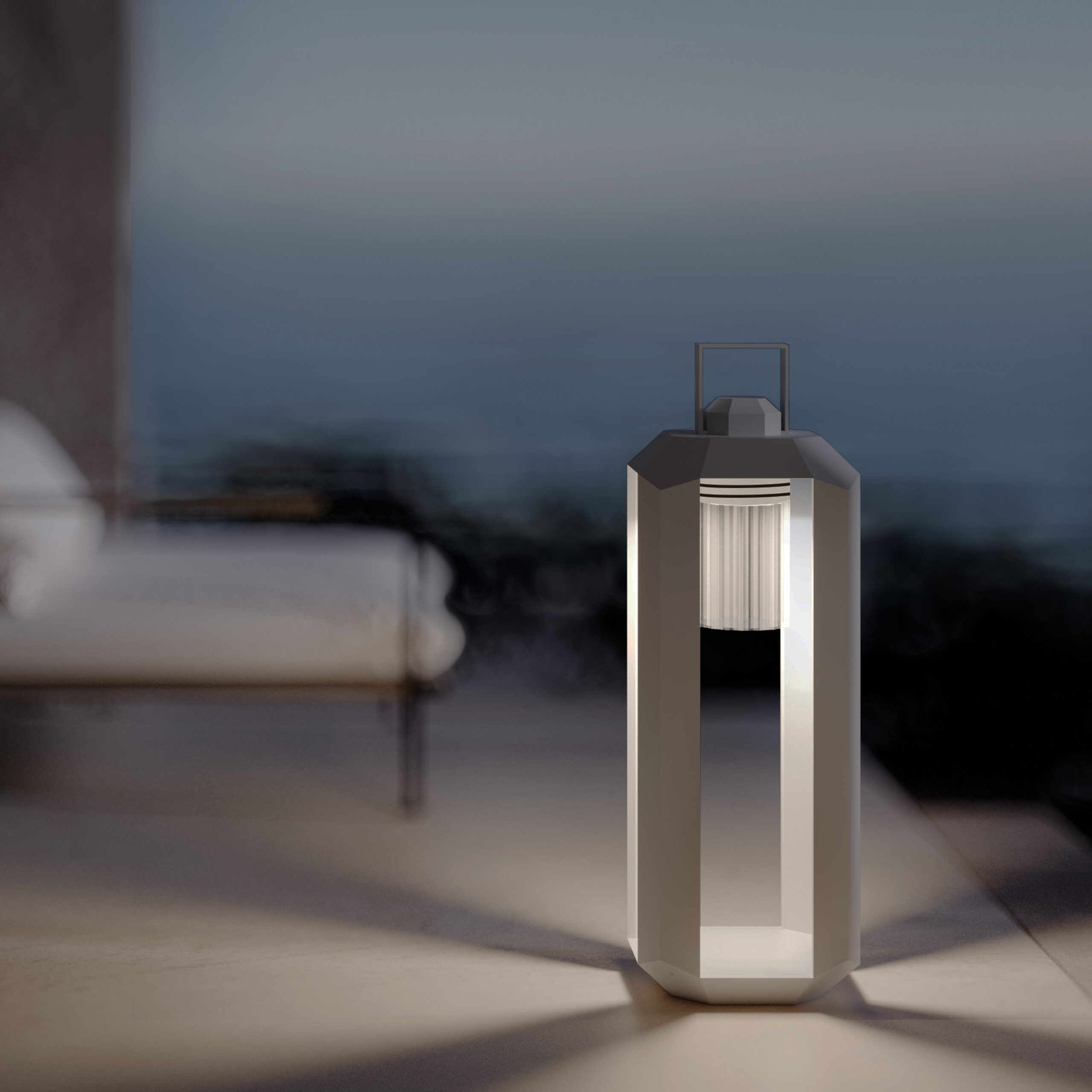 Incarnazione della filosofia di Contardi di portare l’interior design all’esterno, per un outdoor funzionale e di classe. Il modello Cube diventa oggi lanterna da esterno in versione a batteria ricaricabile o cablata. Il modello a batteria presenta un nuovo ed innovativo sistema di accensione, senza interruttore: il solo posizionamento del corpo batteria sul supporto permette l’accensione automatica con una lieve rotazione. Per la ricarica non occorre spostare tutto il prodotto, ma è sufficiente rimuovere il corpo batteria e collegarlo alla corrente. Disponibile con interno oro satinato ed esterno laccato effetto bronzo chiaro oppure tutta in bianco (interno ed esterno).