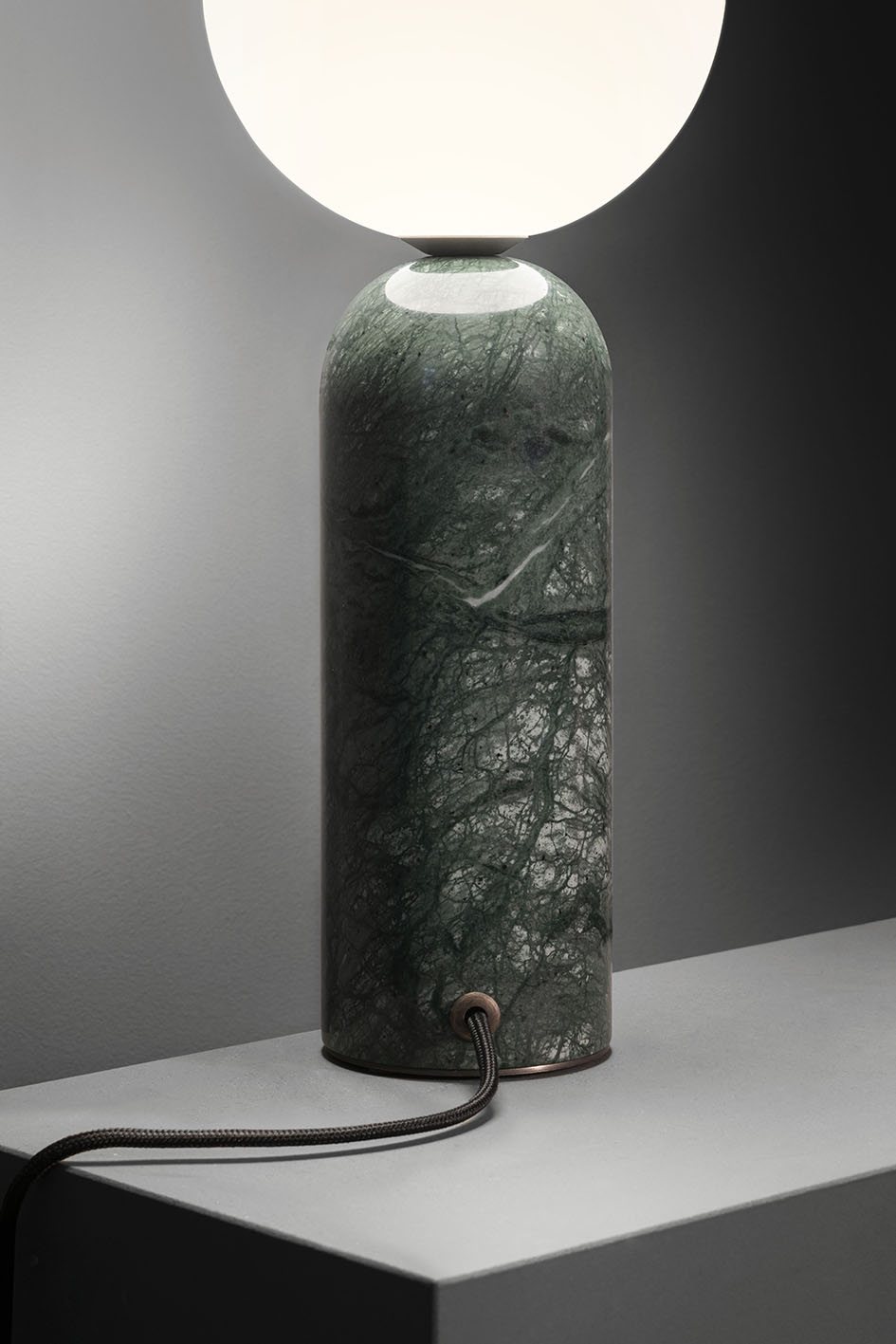 La base nella versione da tavolo, a parete e a plafone, è realizzata in marmo verde Guatemala, bianco Calacatta oppure rosso Levanto.