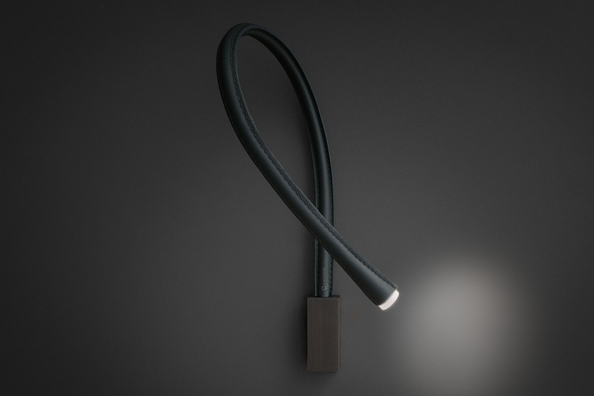 Flexiled, prodotto storico e iconico della collezione di Contardi, disponibile in due varianti, con braccio flessibile rivestito in pelle con doppia cucitura ai lati o ricoperto da una maglia d'acciaio poi avvolto da una guaina trasparente, offre opzioni di personalizzazione nei colori e nelle dimensioni.