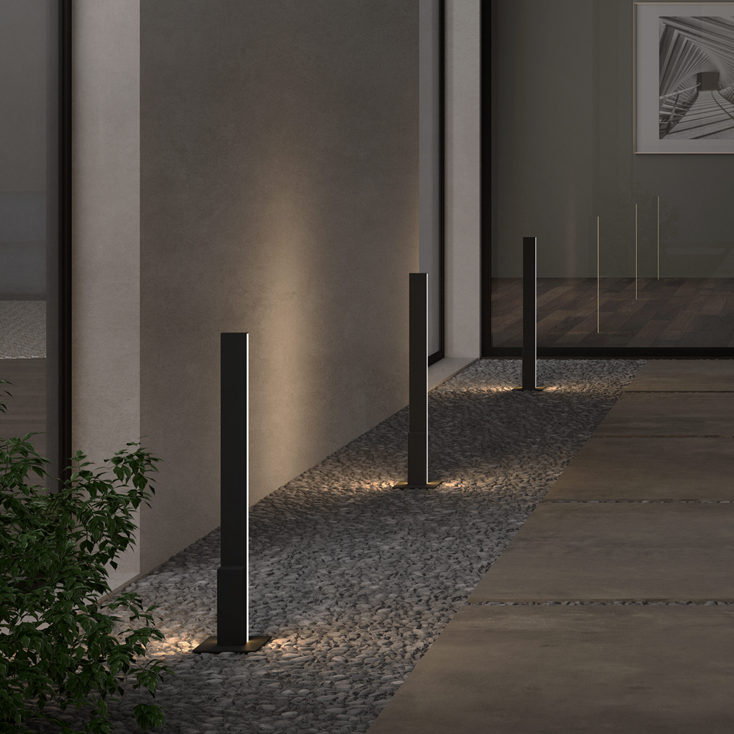 Fly Outdoor è proposta anche in due diverse altezze, 60 o 90 cm, con doppia emissione luminosa. La protezione IP65 la rende ideale per l'uso all'aperto, in zone di passaggio, carrabili, ma anche giardini.