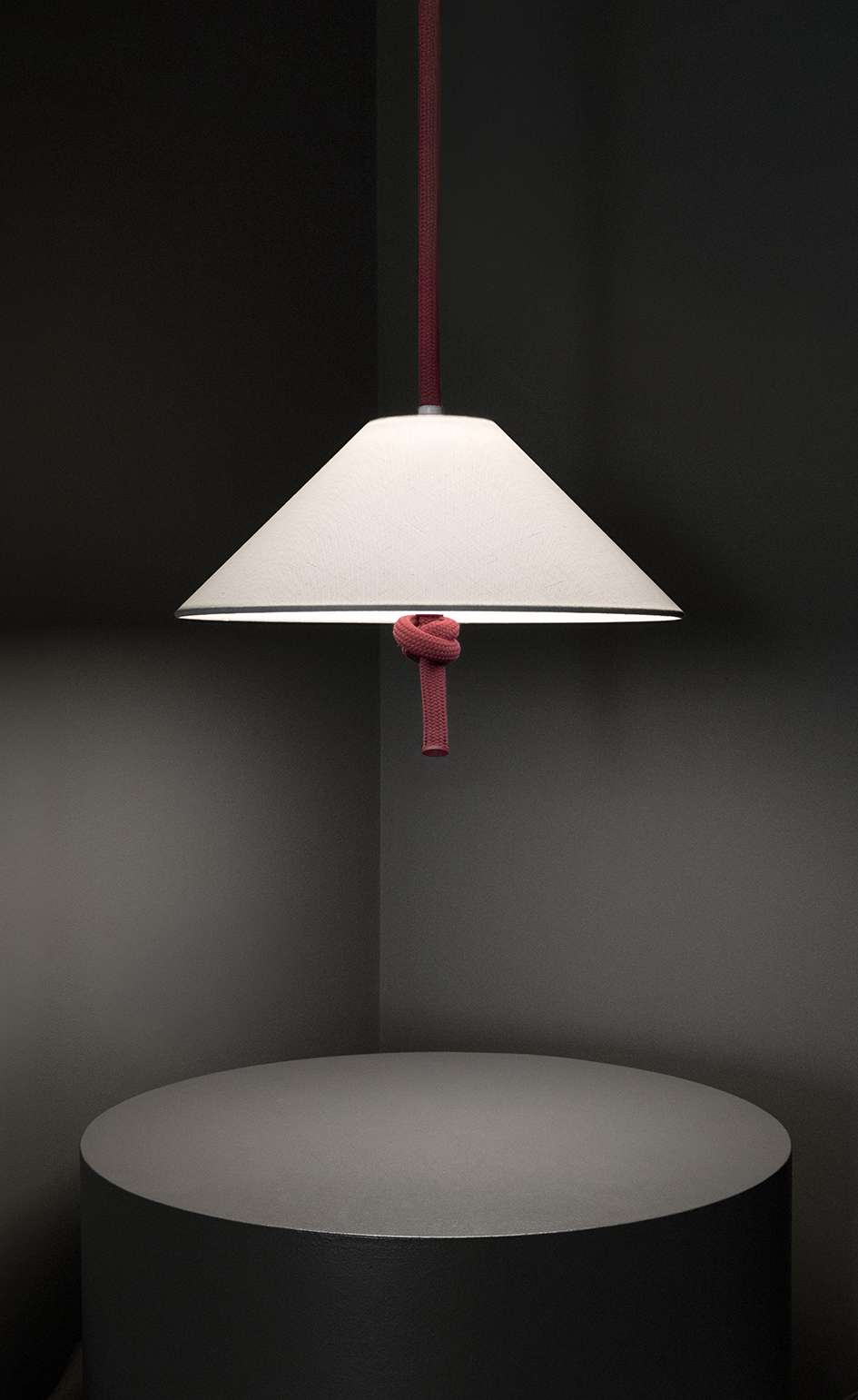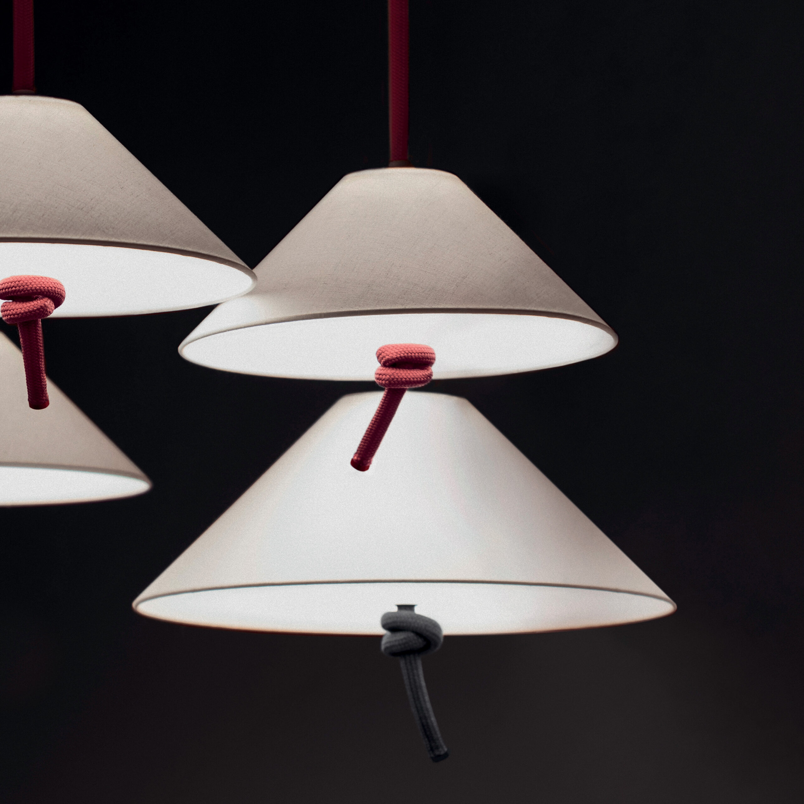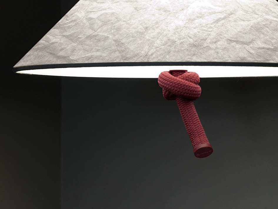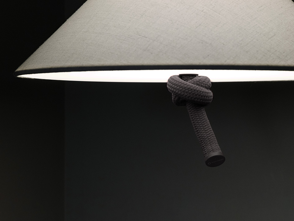 Le lampade a sospensione, da tavolo e da terra, rivestite in corda e illuminate da paralumi bianchi, celebrano un’eleganza rilassata.