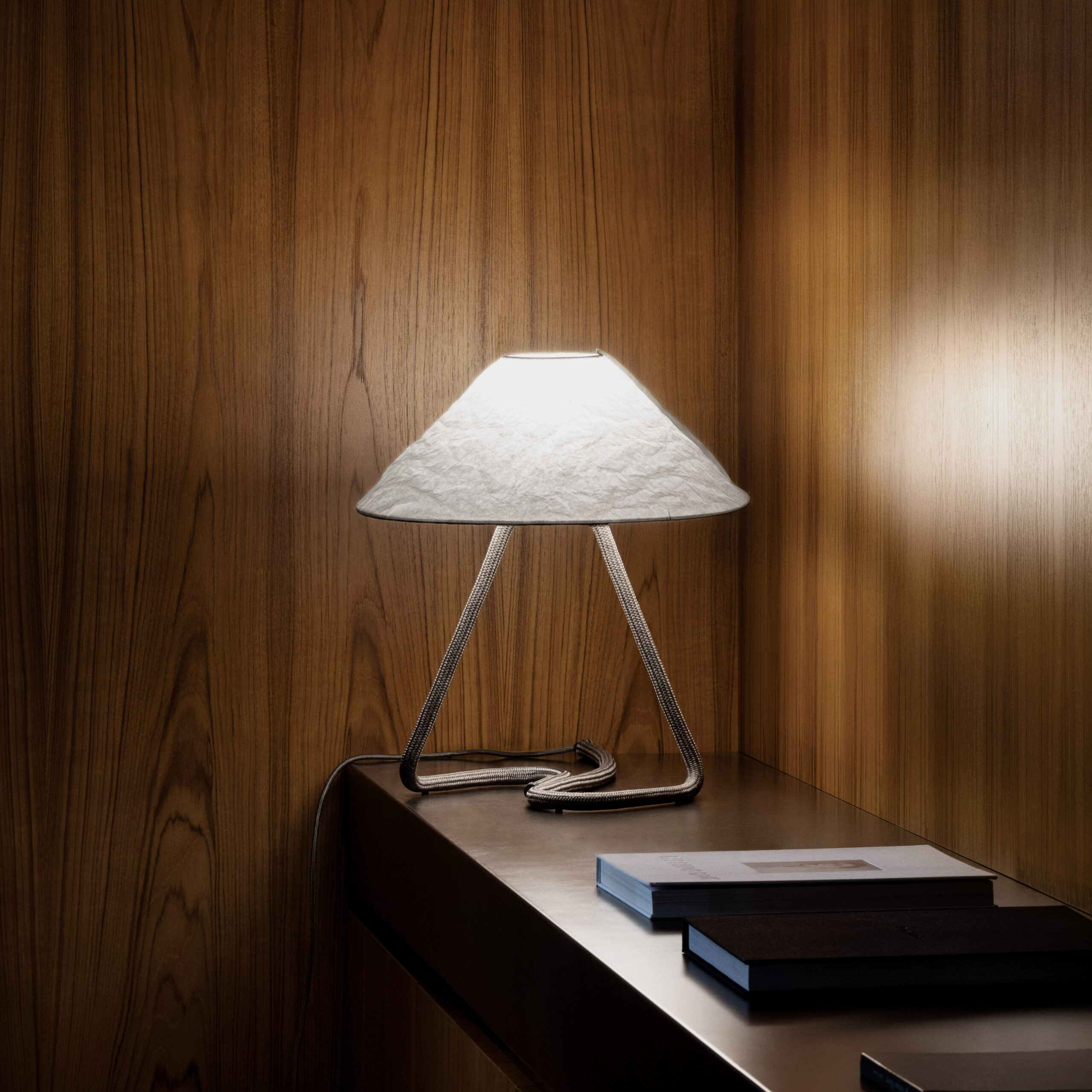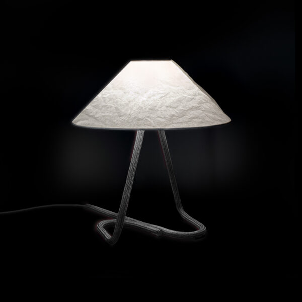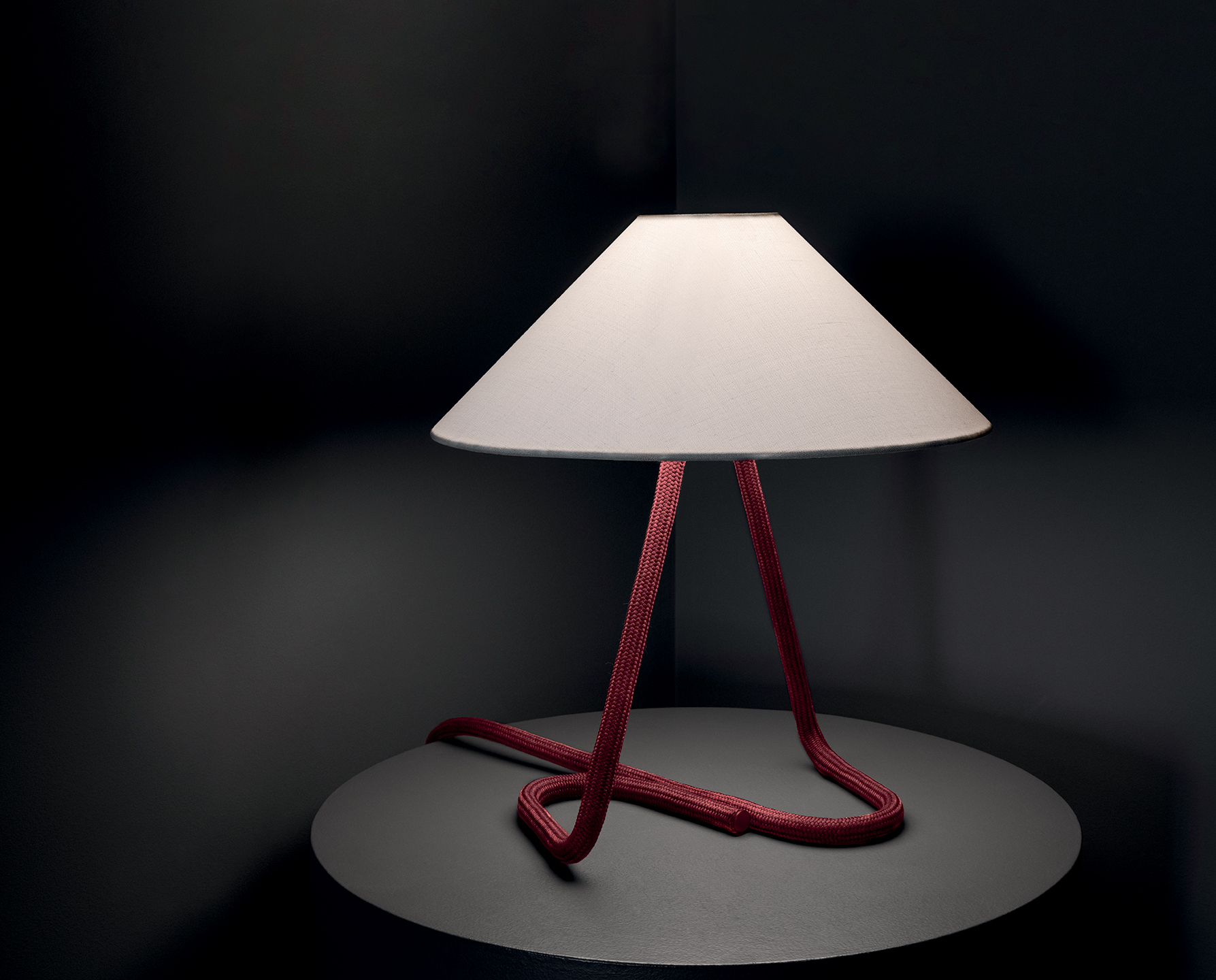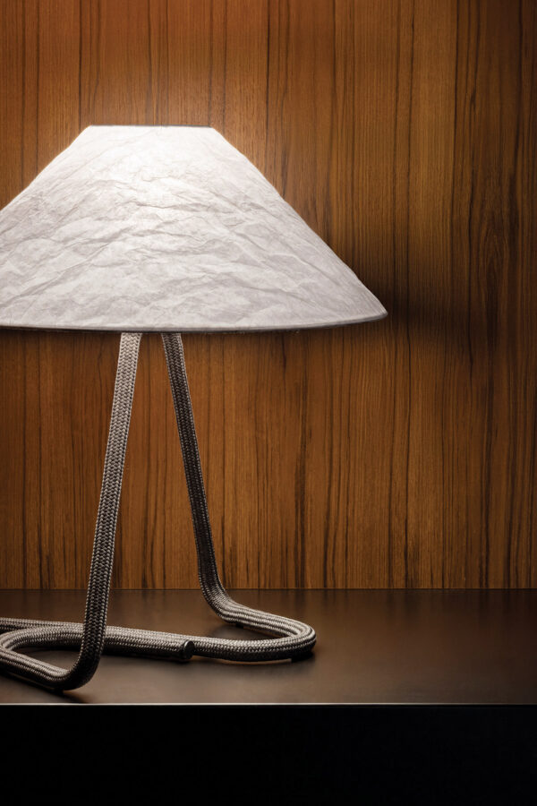 Le lampade a sospensione, da tavolo e da terra, rivestite in corda e illuminate da paralumi bianchi, celebrano un’eleganza rilassata. Materia e luce dialogano in perfetto equilibrio tra artigianalità e visione contemporanea, con un tocco vintage sofisticato.