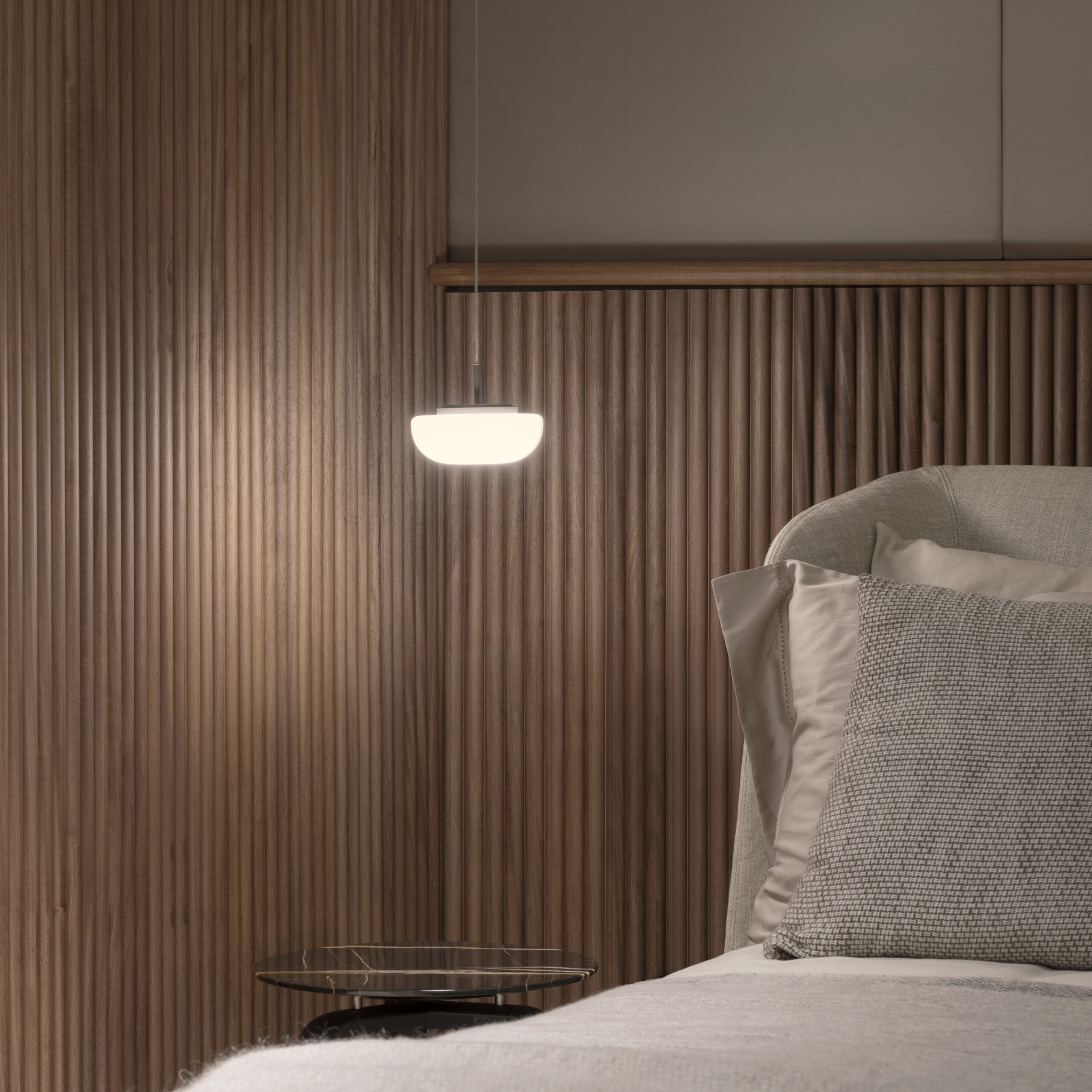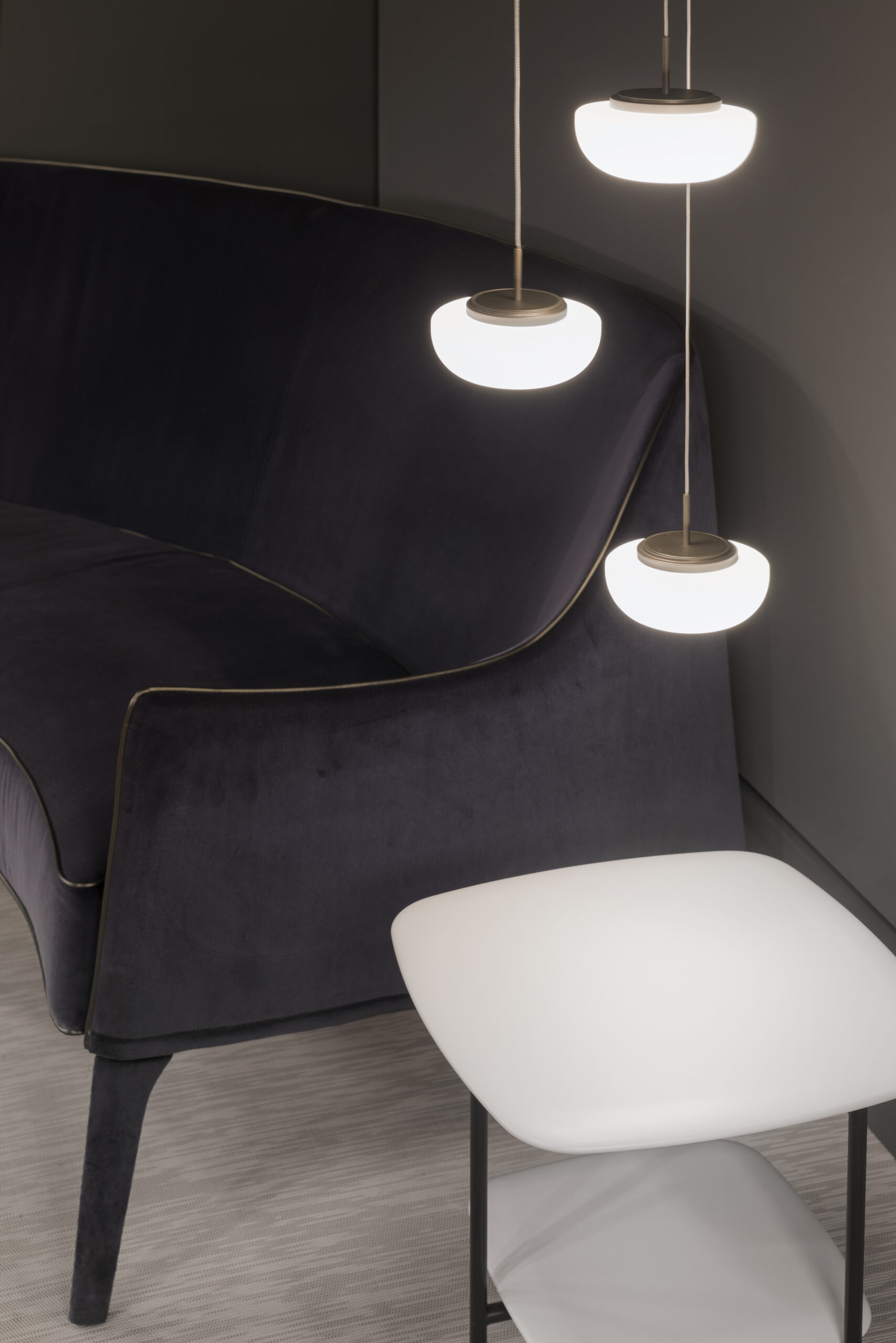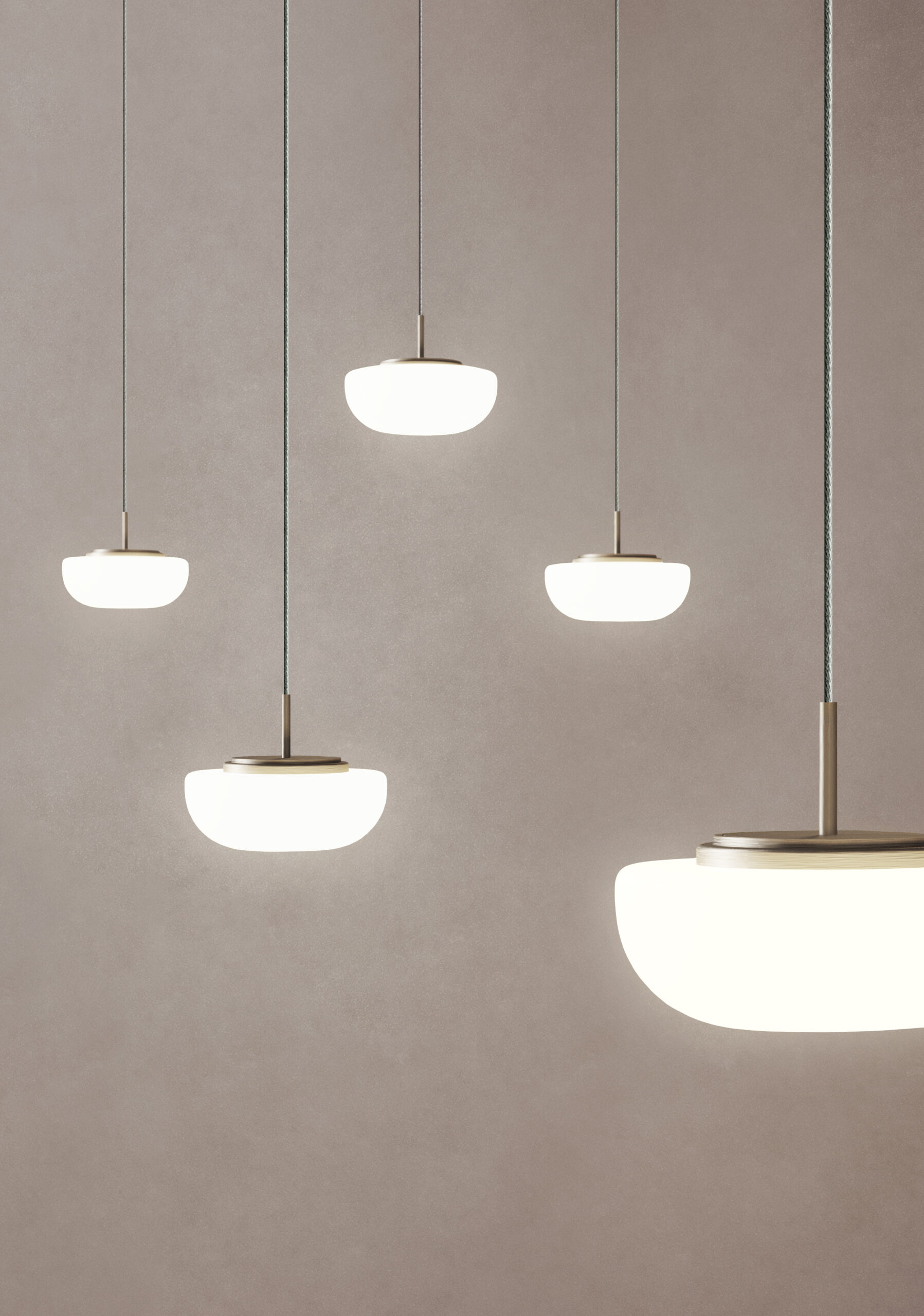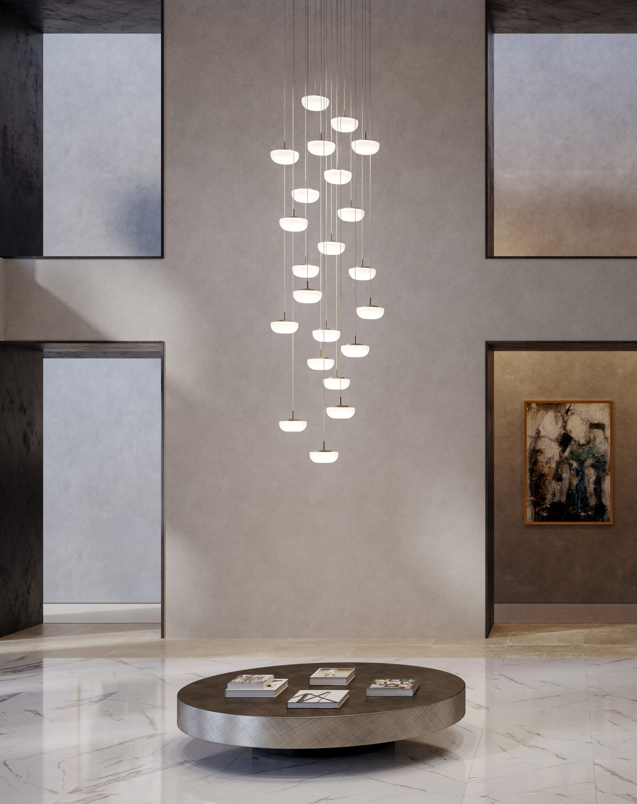 La versione a sospensione, disponibile nella finitura champagne, consente di creare scenografici cluster.