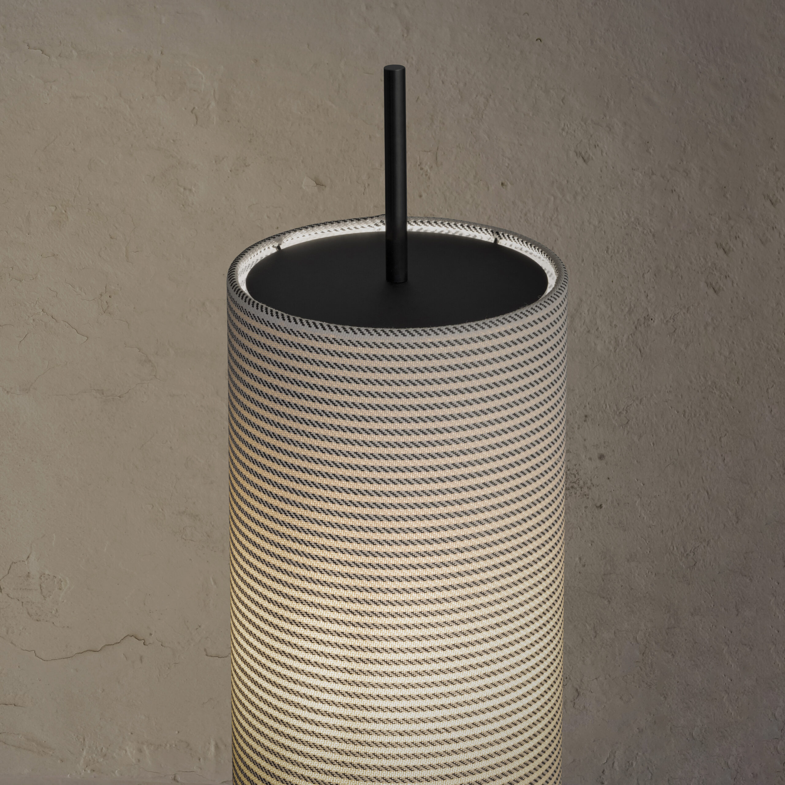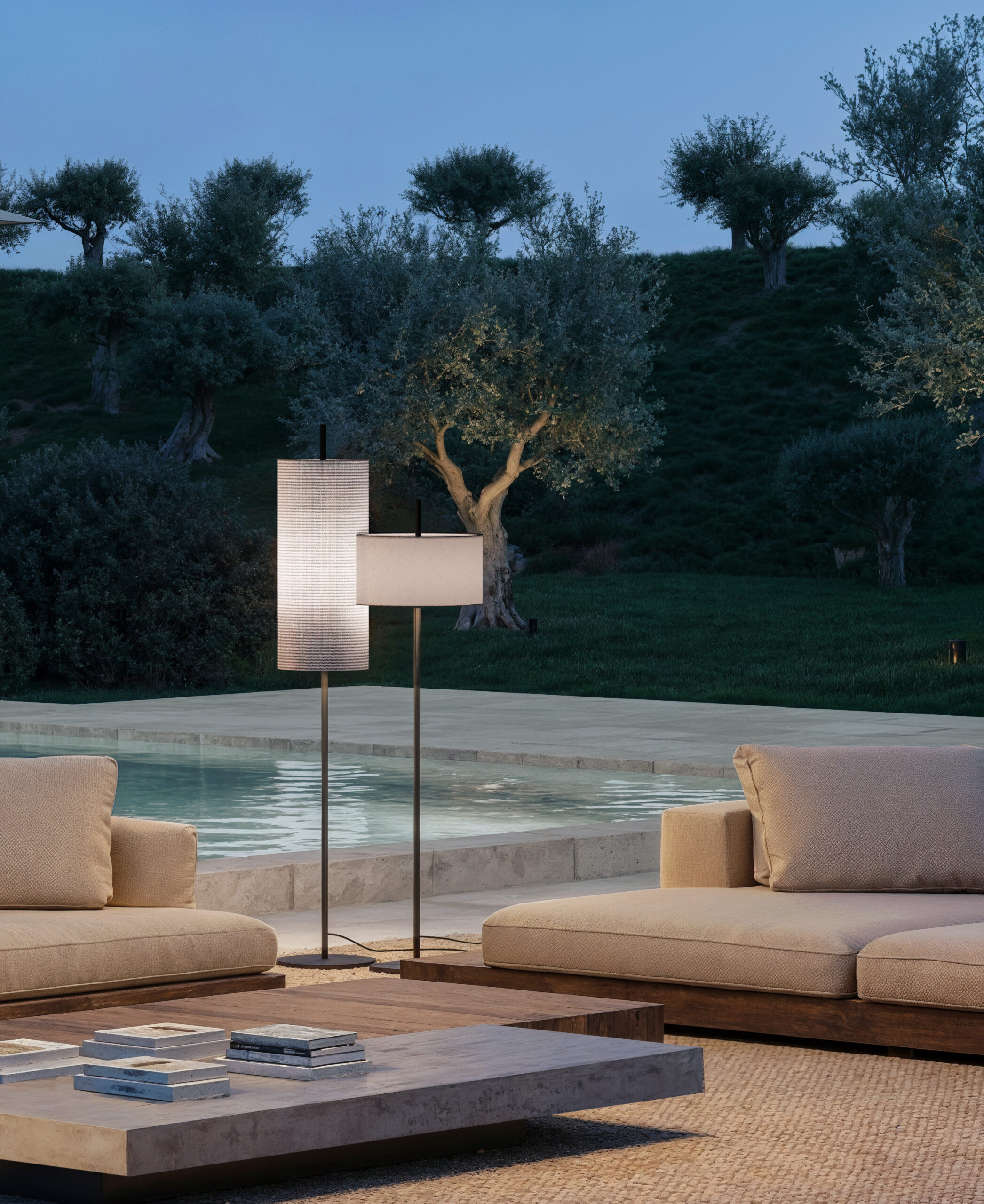 Caratterizzata da una struttura in metallo in nero goffrato con una base rotonda, Lagoon presenta paralumi dalla forma lineare ed essenziale, tutti rivestiti in tessuto Dedar. I colori dei paralumi, definiti da nuance neutre per adattarsi a qualsiasi spazio esterno, sono stabiliti in base alla dimensione: la lampada small presenta una colorazione nera, beige per la medium e bianca con decorazioni orizzontali nere per la large.