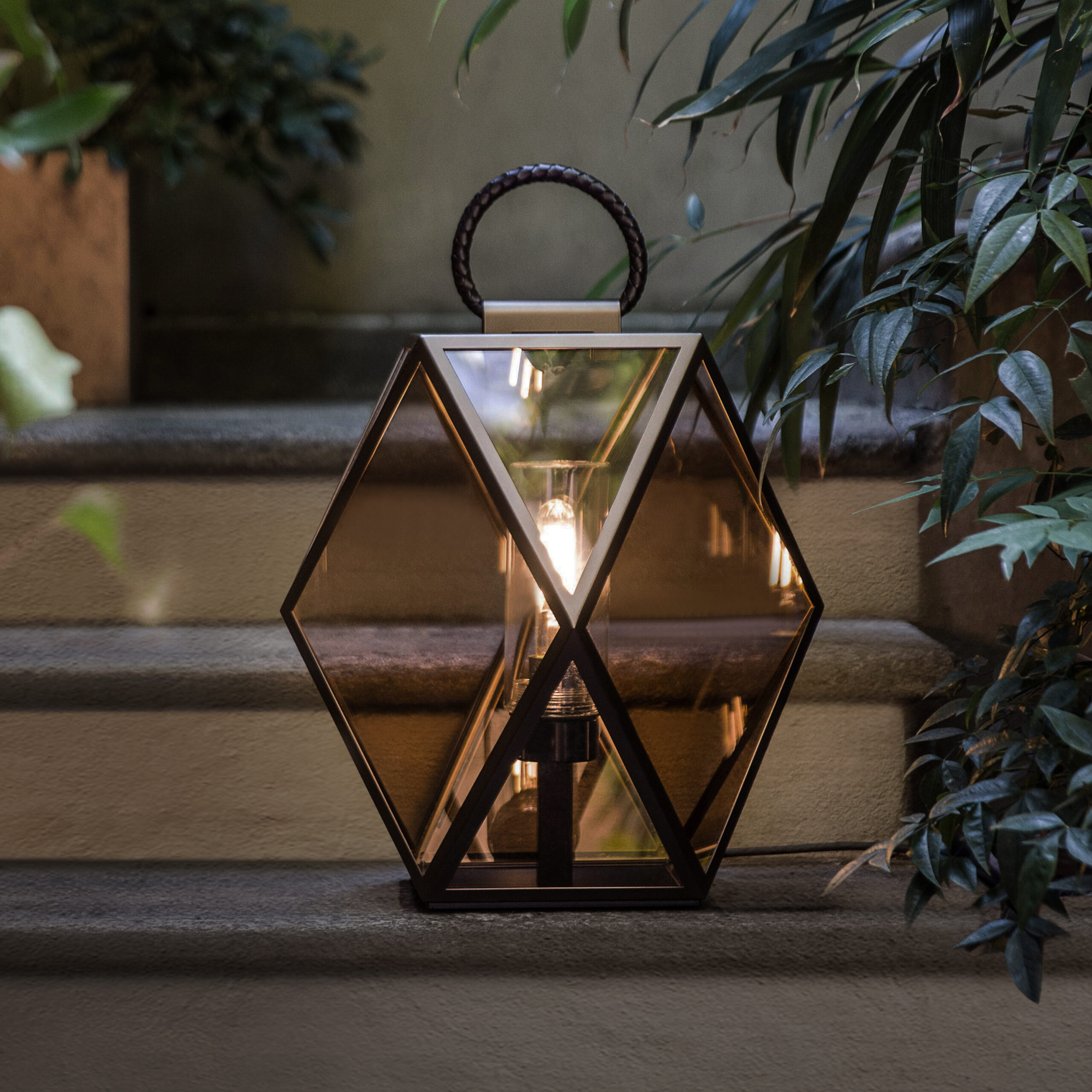 La Muse Lantern Outdoor può essere alimentata a batteria o cablata. Nella versione cablata, la sorgente luminosa è posta all'interno di un cilindro di vetro opportunamente sigillato per garantire la protezione IP65. Il nuovo modello a batteria mantiene le caratteristiche della lanterna ma con un tocco più sofisticato: la sorgente luminosa ha un nuovo look che la rende molto più contemporanea e accattivante. La simulazione della lampadina crea un'alternanza di linee, conferendole un aspetto più moderno, garantendo allo stesso tempo prestazioni migliori. Entrambe le versioni sono ora disponibili nelle dimensioni piccola, media e grande. La finitura bronzo della Lanterna Muse è stata trattata per resistere agli spazi esterni e alle condizioni atmosferiche, con un manico in pelle intrecciata. Il diffusore in plastica nella versione Outdoor rimane in finitura ambra trasparente.