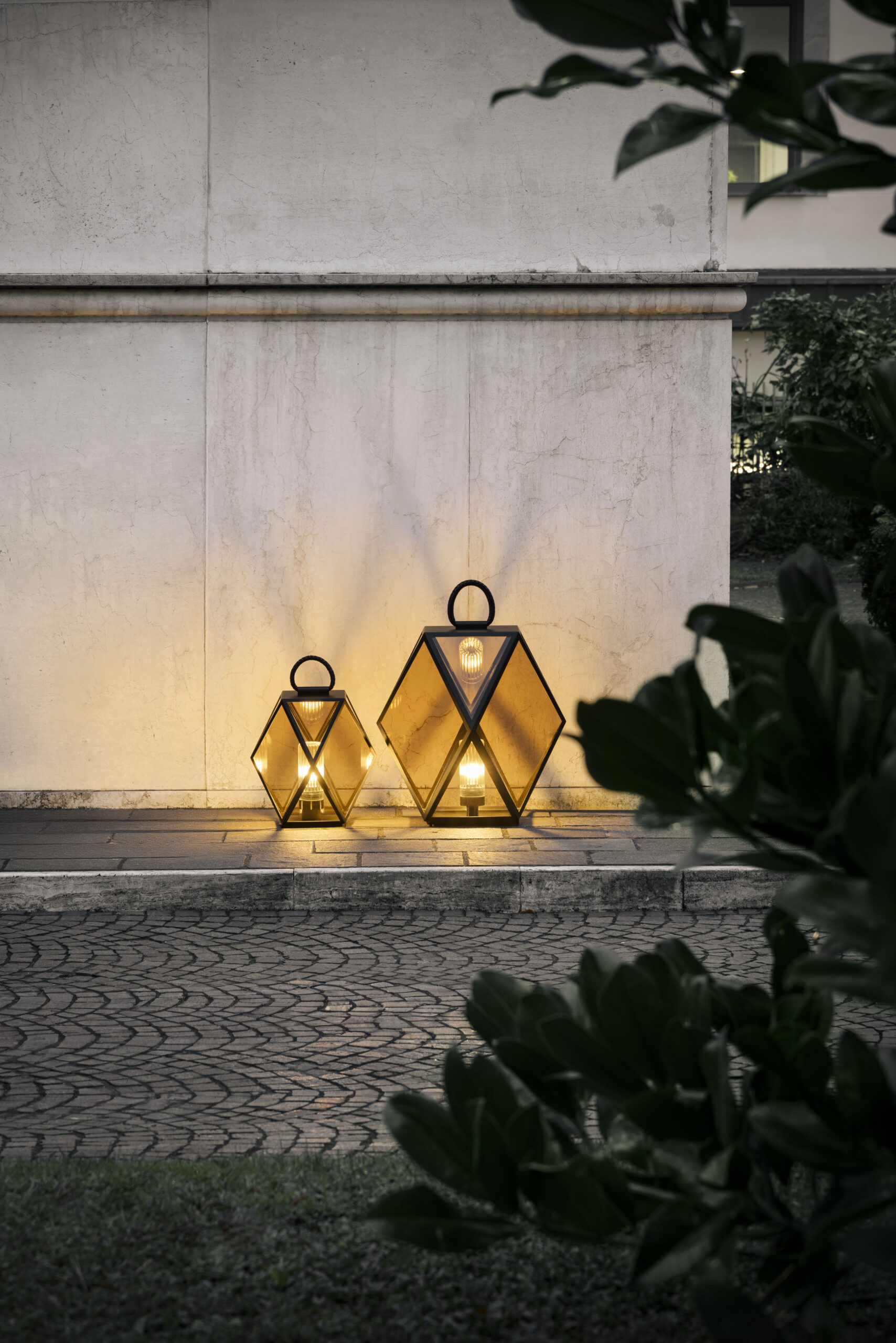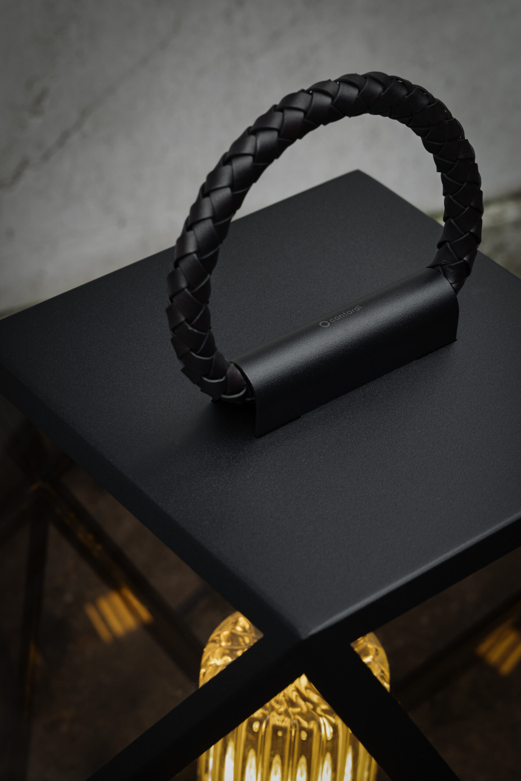 La struttura in metallo di Muse - ora disponibile in quattro nuove finiture: nero, bronzo, terracotta e un raffinato color crema - è impreziosita dalla maniglia in pelle che consente di spostare la lampada agilmente fuori ma anche dentro casa, a terra, su un tavolo, vicino ad una piscina o per illuminare il deck di una barca.