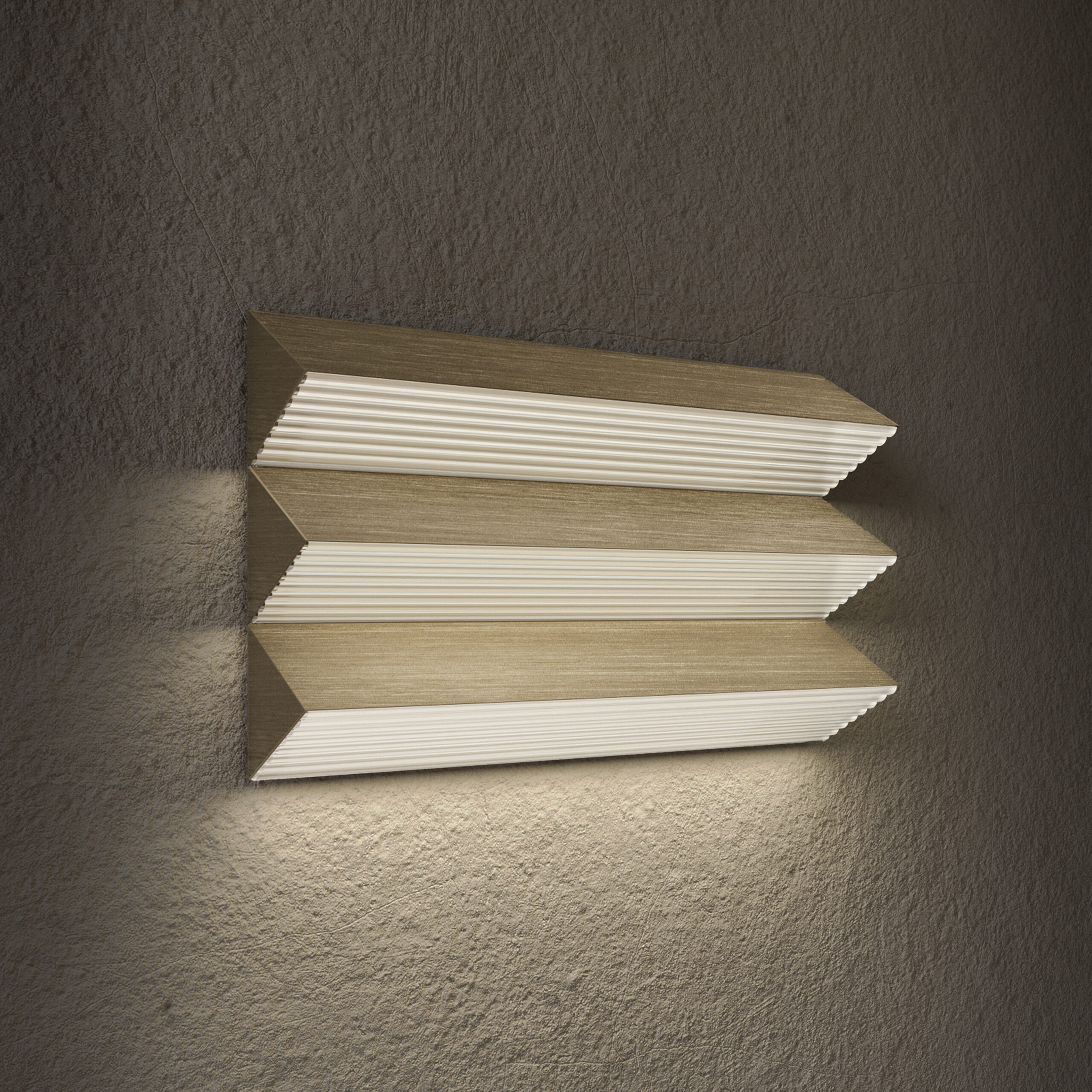 Preziosa semplicità. Elementi triangolari dalle linee pure ed essenziali, che emanano una luce suggestiva pur essendo funzionali. La luce diventa protagonista, grazie al diffusore rigato, scelto ad hoc per produrre giochi di luce unici in vari contesti.